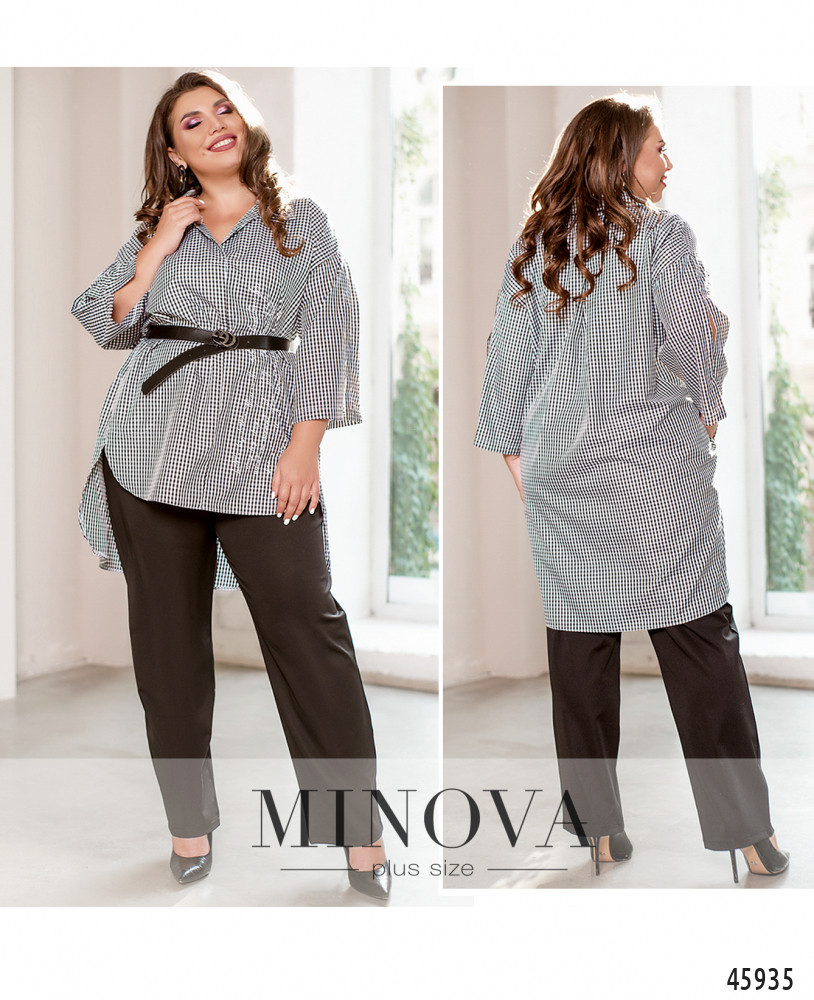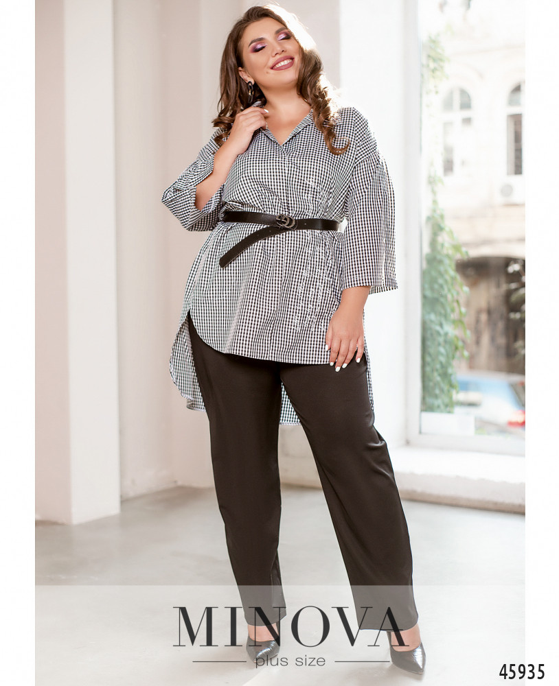 Комфортный контрастный костюм, состоящий из рубашки и брюк, отличается удобством и практичностью. Яркая клетчатая рубашка с длинными рукавами и воротником, изюминкой которой являются ассиметричный низ и свободный крой oversize, идеально дополнена минималистичными однотонными брюками на резинке с карманами в боковых швах.