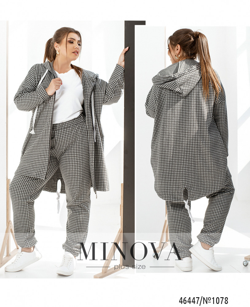 Женственный и мягкий костюм в стиле casual порадует поклонниц практичной одежды на каждый день. Комфортные брюки-джоггеры с карманами и резинками, вшитыми по линии талии и по низу штанин, гармонично дополняет удлиненная туника с капюшоном и карманами, застегивающаяся на змейку спереди. По низу туники вставлен шнурок, завязанный на узелок сзади. Пояс НЕ входит в комплект.