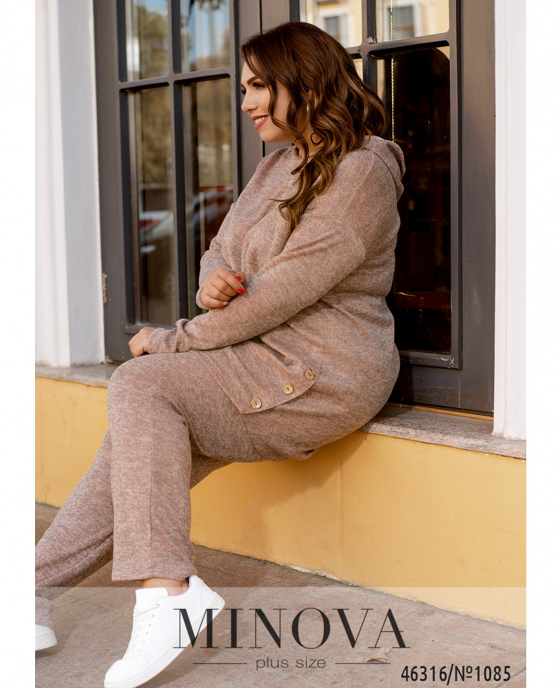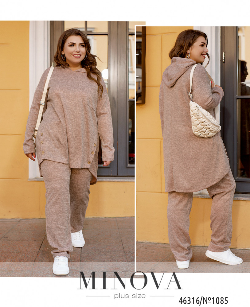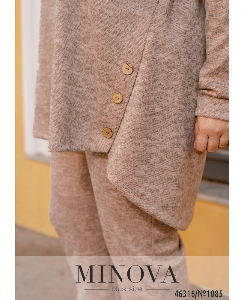 Мягкий и уютный костюм создает не только красоту, уверенность и комфорт, но и подчеркивает индивидуальный стиль. В комплект входят минималистичные брюки на резинке с карманами и необычная туника в тон, дополненная ассиметричным низом, капюшоном и рукавами с приспущенной линией плеч, а также декорированная пуговицами спереди по бокам.