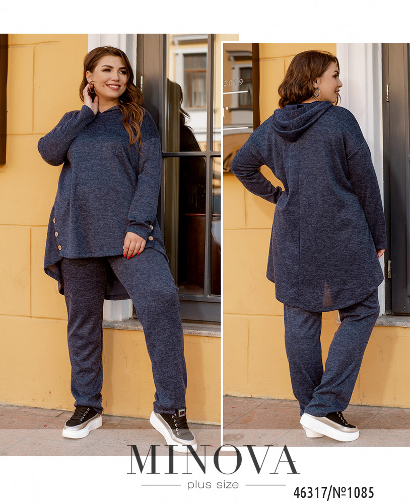 Мягкий и уютный костюм создает не только красоту, уверенность и комфорт, но и подчеркивает индивидуальный стиль. В комплект входят минималистичные брюки на резинке с карманами и необычная туника в тон, дополненная ассиметричным низом, капюшоном и рукавами с приспущенной линией плеч, а также декорированная пуговицами спереди по бокам.