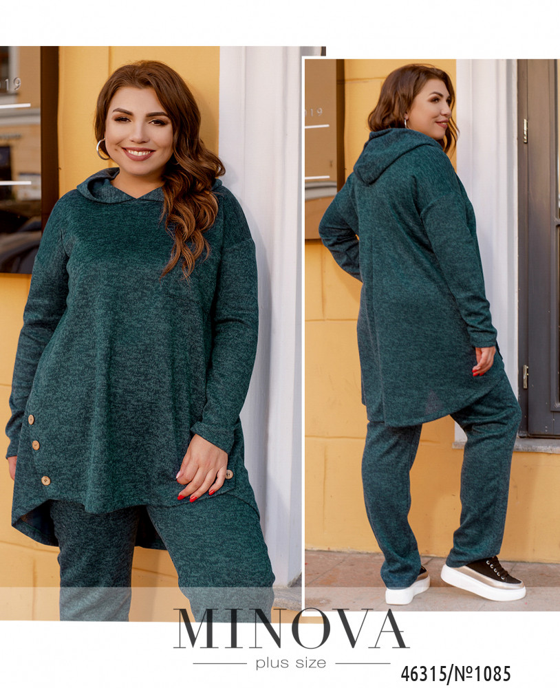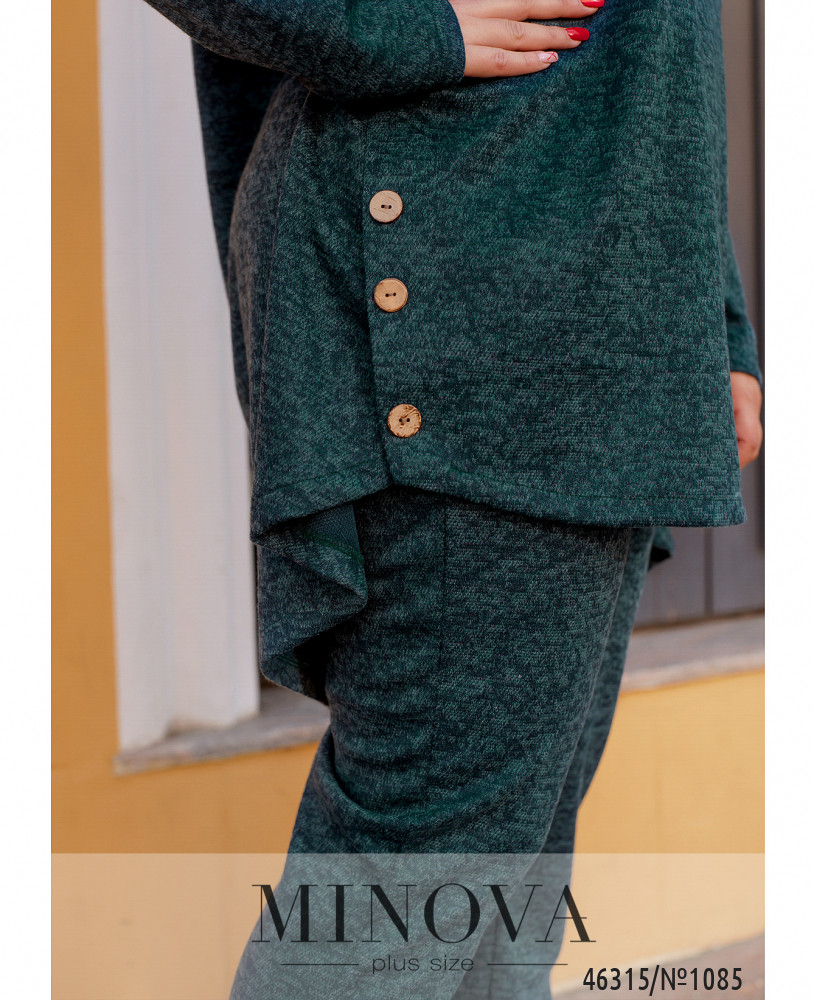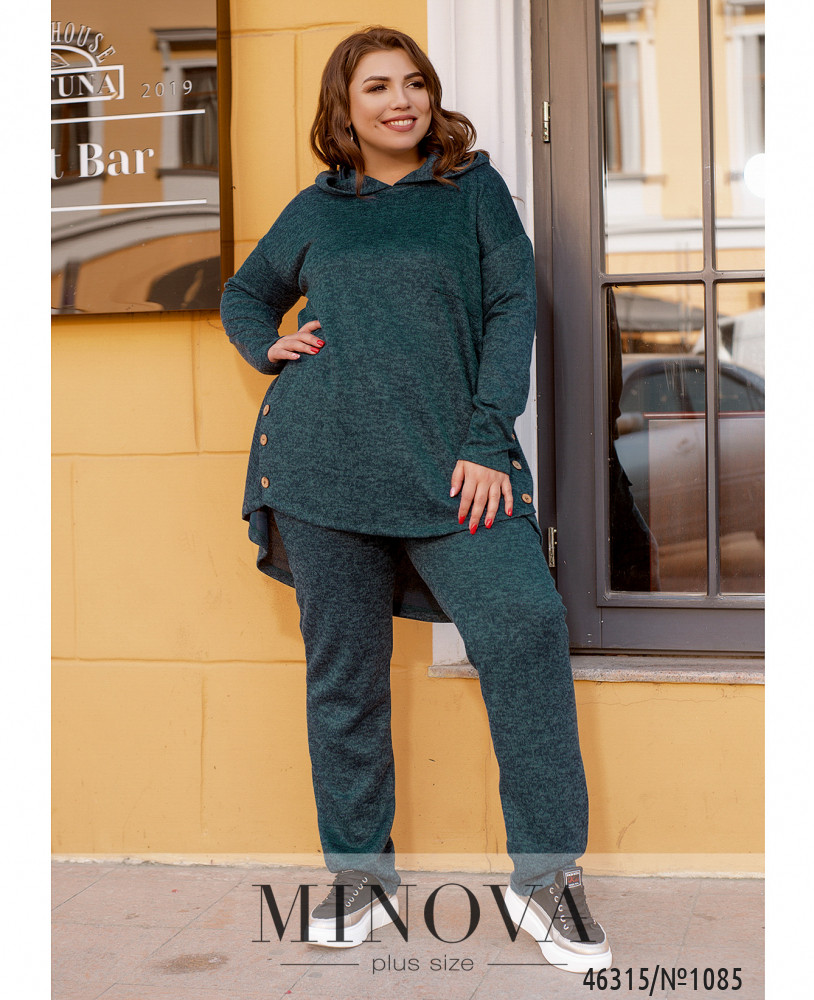 Мягкий и уютный костюм создает не только красоту, уверенность и комфорт, но и подчеркивает индивидуальный стиль. В комплект входят минималистичные брюки на резинке с карманами и необычная туника в тон, дополненная ассиметричным низом, капюшоном и рукавами с приспущенной линией плеч, а также декорированная пуговицами спереди по бокам.