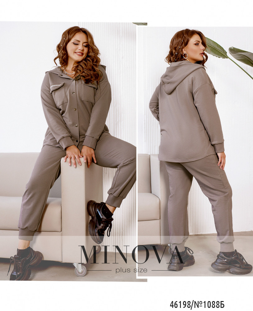 Костюм в стиле casual, выполненный из плотной мягкой ткани, прочно войдет и идеально дополнит ваш базовый осенний гардероб. Лаконичные брюки-джоггеры на резинке с карманами и манжетами идеально дополняет кофта с застежкой на кнопках, капюшоном и накладными карманами с клапанами на груди, украшенная декоративными принтами.