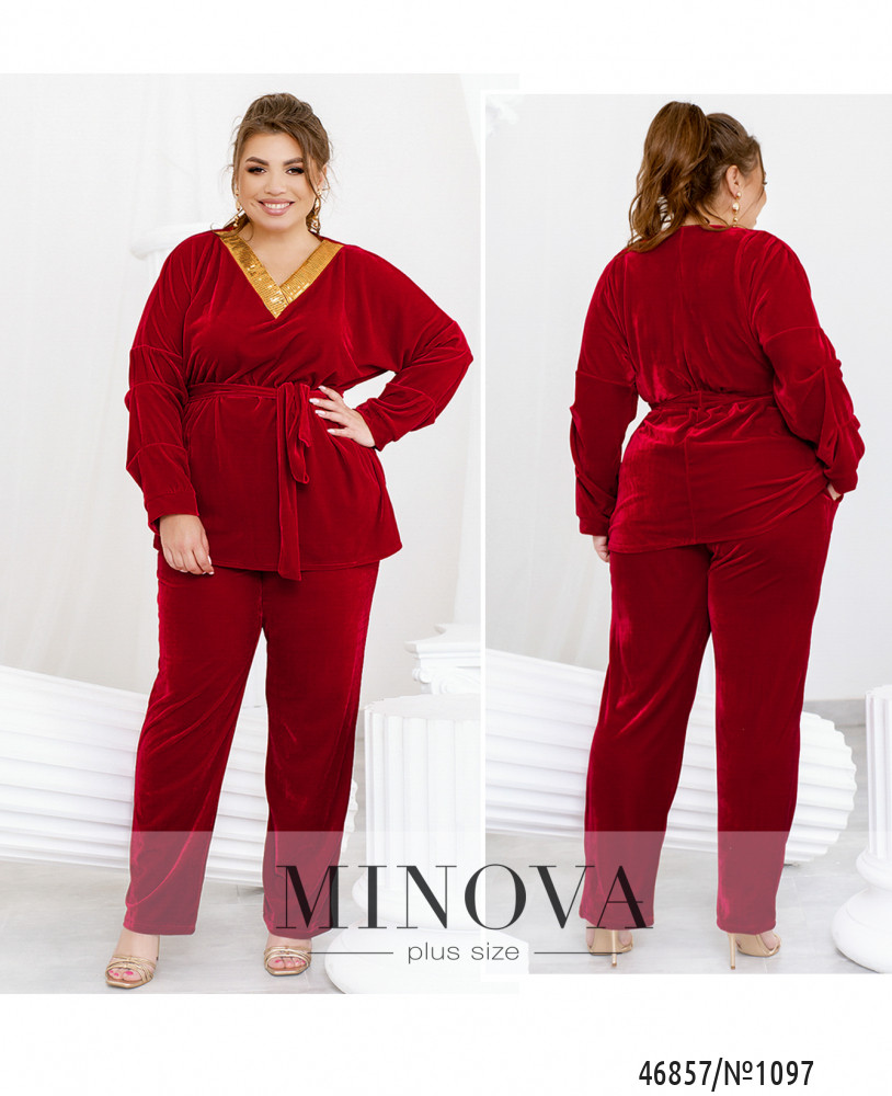 Яркий костюм, выполненный из мягкого велюра, подарит вам комфорт и придаст уверенности в своей неотразимости. В комплект входят лаконичные брюки на резинке с карманами и туника свободного кроя, украшенная сияющими пайетками в области горловины.