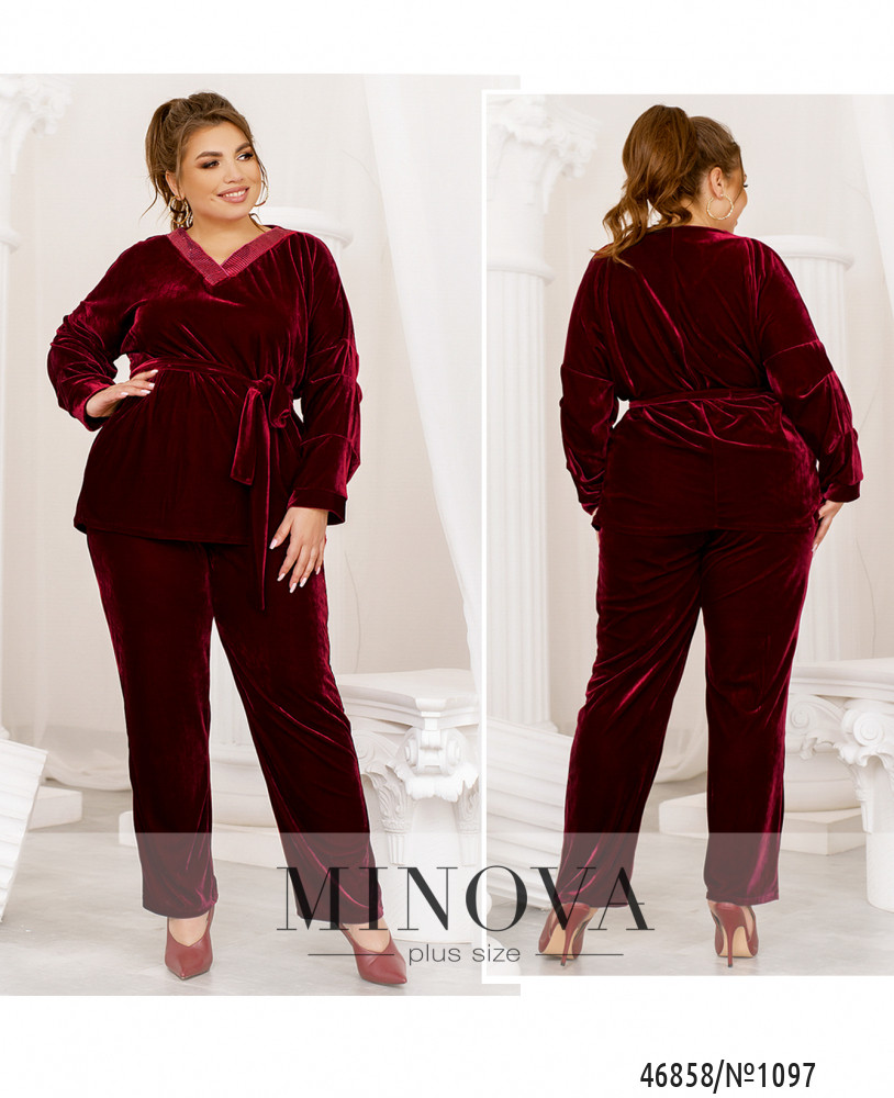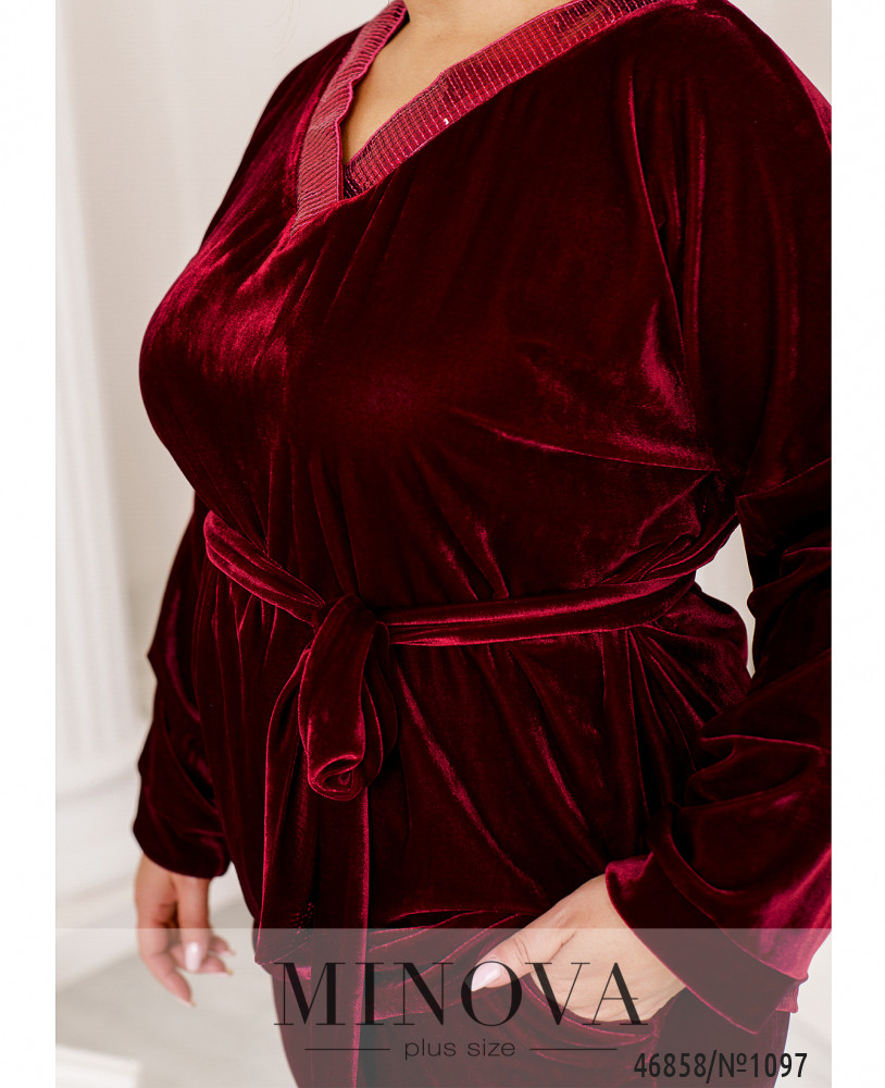 Яркий костюм, выполненный из мягкого велюра, подарит вам комфорт и придаст уверенности в своей неотразимости. В комплект входят лаконичные брюки на резинке с карманами и туника свободного кроя, украшенная сияющими пайетками в области горловины.