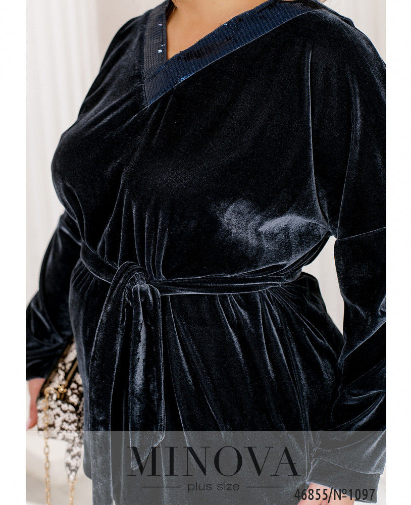 Яркий костюм, выполненный из мягкого велюра, подарит вам комфорт и придаст уверенности в своей неотразимости. В комплект входят лаконичные брюки на резинке с карманами и туника свободного кроя, украшенная сияющими пайетками в области горловины.