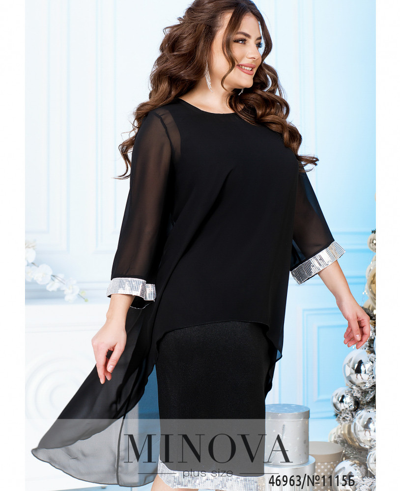 Яркий нарядный комплект, украшенный пайетками, можно носить вместе или разделить, создавая вечерние образы с другими вещами. Изящное однотонное платье-футляр без рукавов идеально дополнено воздушное шифоновой накидкой с длинными рукавами и ассиметричным подолом, удлиненным по спинке.