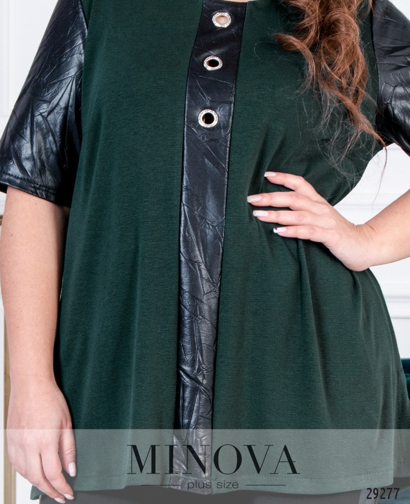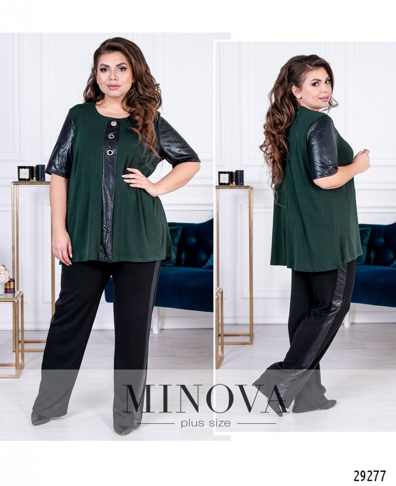 Костюм-двойка со вставками из эко-кожи. Костюм представлен свободной кофтой с короткими рукавами и прямыми брюками с лампасами. Расклешенная туника с разрезами по бокам. Рукава и декоративная планка изготовлены из эко-кожи. Планка украшена люверсами. Брюки с карманами украшены лампасами из эко-кожи. Пояс представлен резинкой.