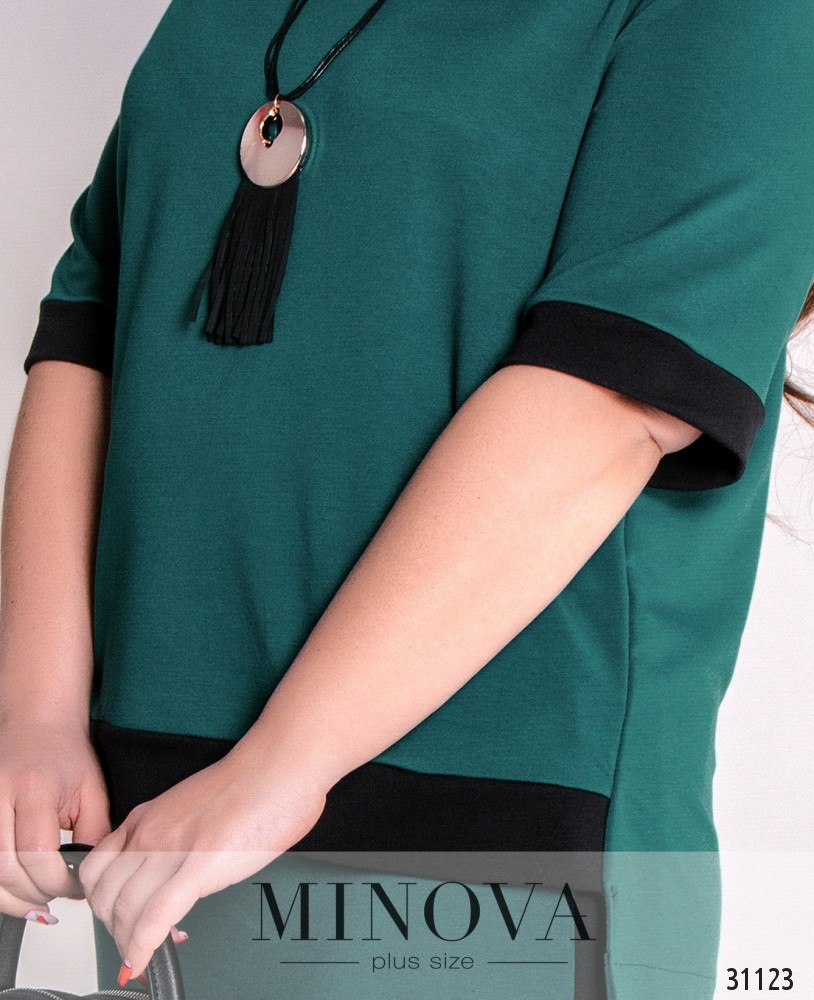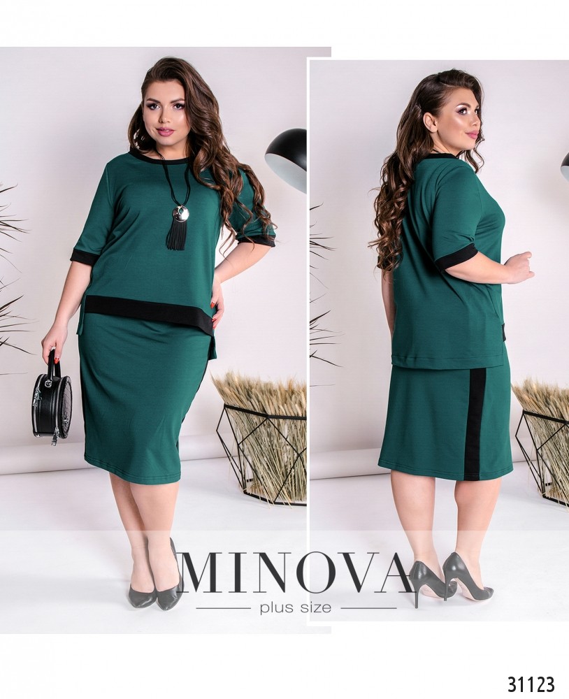 Костюм-двойка с юбкой. Прямая кофта с короткими рукавами и удлиненным подолом на спине. Подол и рукава оформлены контрастным кантом. Прямая юбка-труба оформлена лампасами по бокам. Пояс юбки оформлен плоской резинкой. К костюму прилагается подвеска.