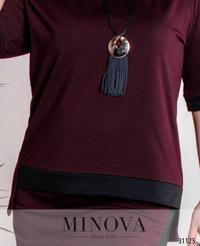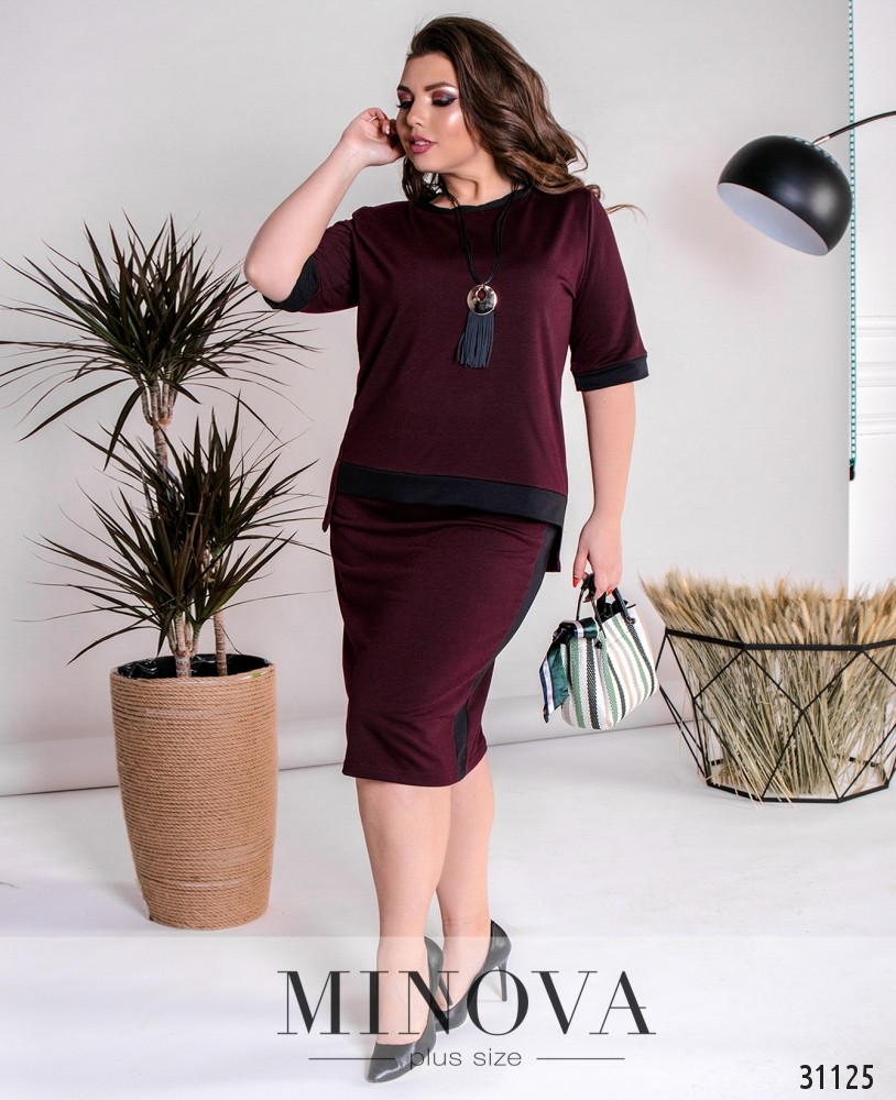 Костюм-двойка с юбкой. Прямая кофта с короткими рукавами и удлиненным подолом на спине. Подол и рукава оформлены контрастным кантом. Прямая юбка-труба оформлена лампасами по бокам. Пояс юбки оформлен плоской резинкой. К костюму прилагается подвеска.