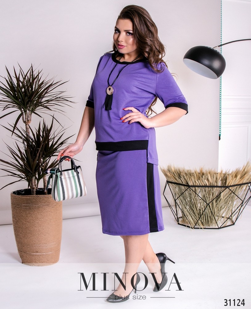 Костюм-двойка с юбкой. Прямая кофта с короткими рукавами и удлиненным подолом на спине. Подол и рукава оформлены контрастным кантом. Прямая юбка-труба оформлена лампасами по бокам. Пояс юбки оформлен плоской резинкой. К костюму прилагается подвеска.