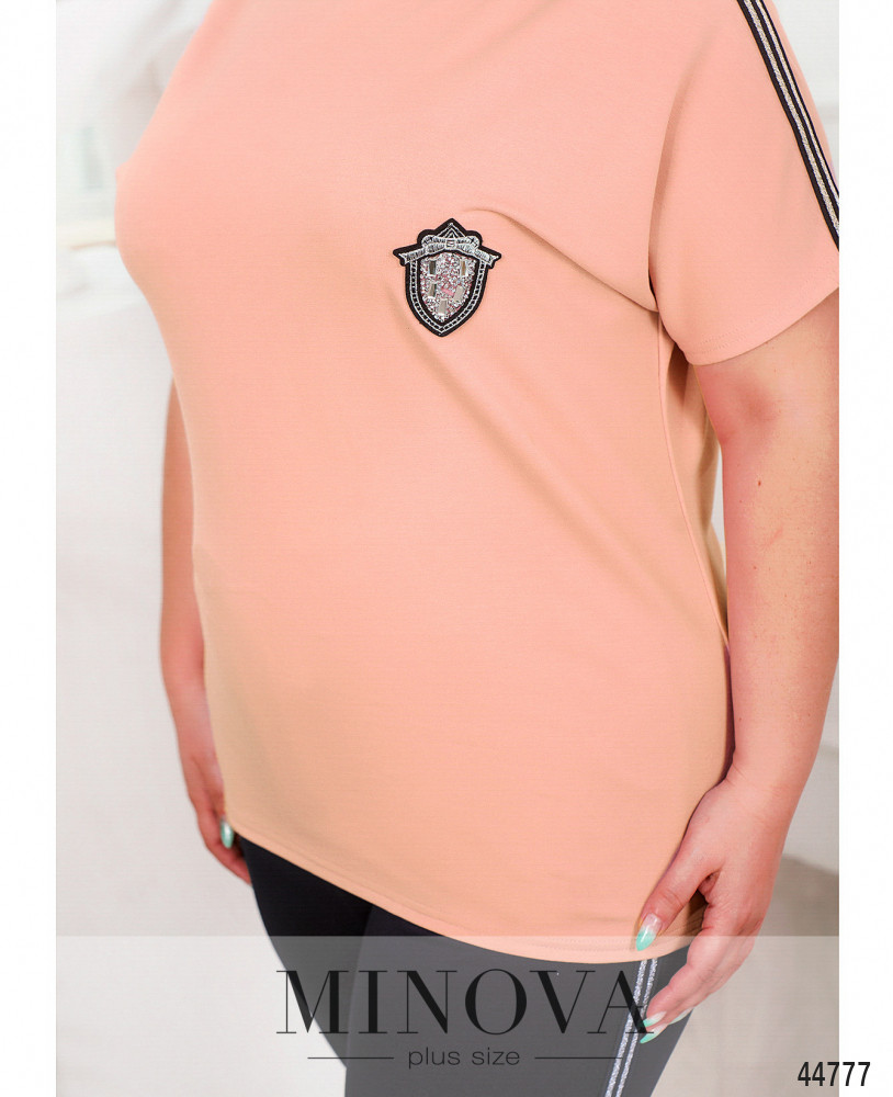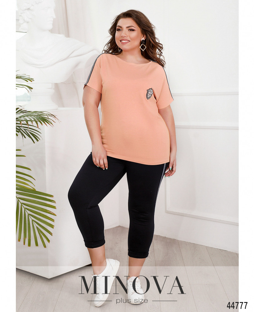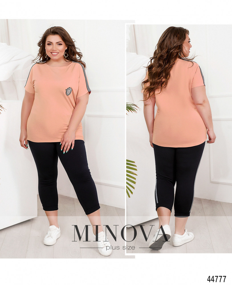 Яркий костюм с блузой и брюками. Брюки со вшитой в пояс резинкой, а также с пропущенным шнурком, отверстия укреплены люверсами. По бокам - карманы в шве, а также лампасы. Снизу небольшие подвороты. Блуза с рукавом "летучая мышь" без манжетов, на груди - декоративная нашивка, вырез горловины "лодочка", на плечах лампасы, карманов нет.