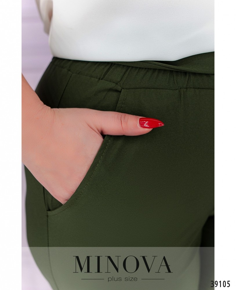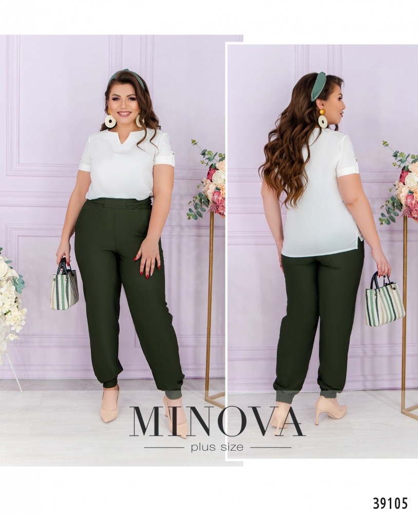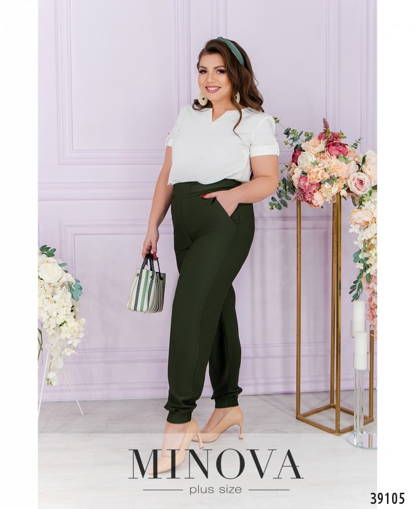 Удобный минималистичный повседневный костюм-двойка с брюками и блузой. Брюки с высокой посадкой, в пояс сзади вшита резинка, снизу - манжеты, в них также сзади вшита резинка. Спереди на талии подшит пояс. По бокам - врезные карманы. Блуза с вырезом горловины "фигурное каре", рукава с подворотами, фиксированными лентой, на груди вытачки, без застёжек и карманов.