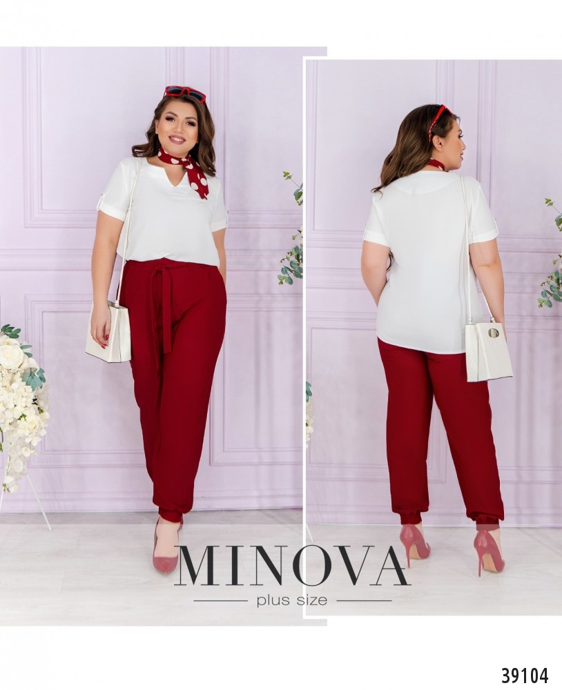 Удобный минималистичный повседневный костюм-двойка с брюками и блузой. Брюки с высокой посадкой, в пояс сзади вшита резинка, снизу - манжеты, в них также сзади вшита резинка. Спереди на талии подшит пояс. По бокам - врезные карманы. Блуза с вырезом горловины "фигурное каре", рукава с подворотами, фиксированными лентой, на груди вытачки, без застёжек и карманов.