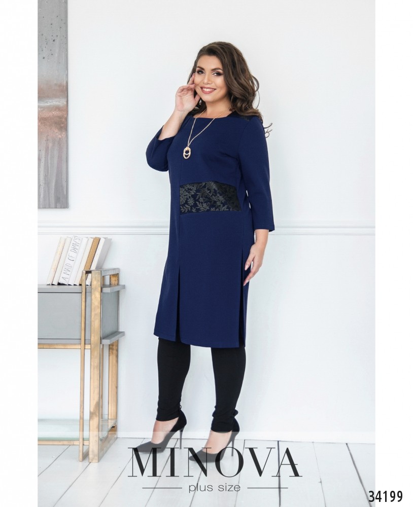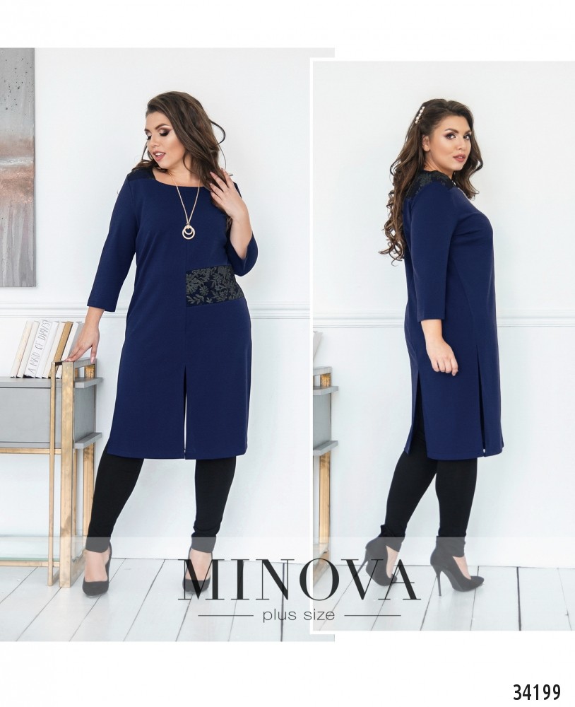 Очень нарядный и в то же время строгий костюм-двойка от Minova пригодится даже для соблюдения офисного дресс-кода, и особенно удачен будет для повседневного ношения: элементы декора делают его более праздничным. Кофта в виде платья, плечи, кокетка на спине и часть пояса слева украшены изящными гипюровыми накладками. Вырез горловины – фигурное каре. Рукава до локтя, свободные. Спереди и сзади на подоле по центру симметричные разрезы, добавляющие свободы движениям. В дополнение – длинная элегантная подвеска. На груди – вытачки, карманов и застёжек нет. Брюки без карманов, со вшитой на поясе резинкой. Очень удачный вариант для «прямоугольной» фигуры, можно носить с балетками или другой удобной, но лучше нарядной, обувью.