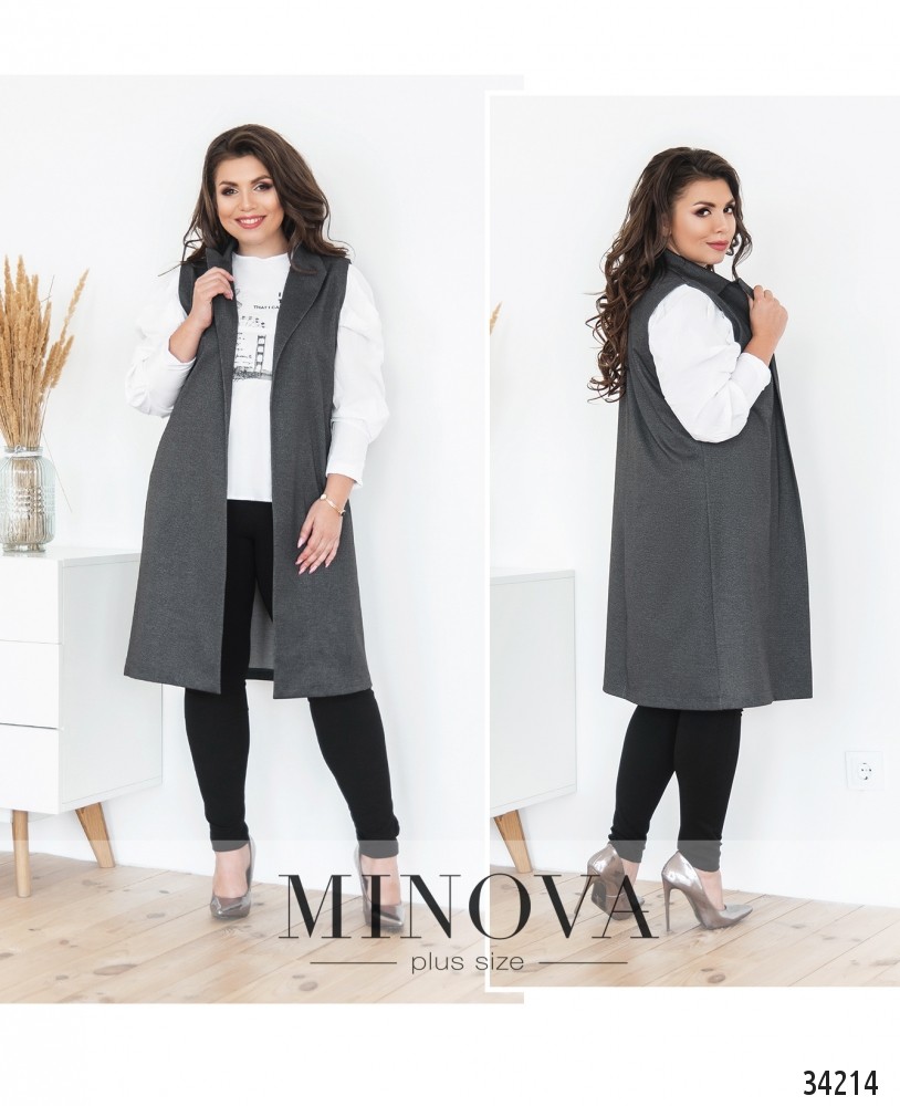 Длинные жилетки – хит сезона 2019-2020! Minova предлагает множество вариаций, в данном случае это костюм-двойка с жилеткой. В её фасоне нашли отражение и пиджачный стиль – за счёт довольно жёстких лацканов, и фасон кардигана – застёжки и карманы отсутствуют. Подкладки изнутри нет, ткань гладкая и приятная к телу. Расцветки могут быть тёмными или пастельными, в одной вариации присутствует принт в мелкую клетку. Также в комплекте прилагаются лосины из мягкой ткани, со вшитой в пояс резинкой и наличием карманов. Осталось только выбрать подходящий верх и удобную обувь, а также позаботиться об аксессуарах, и ваш образ будет завершён!