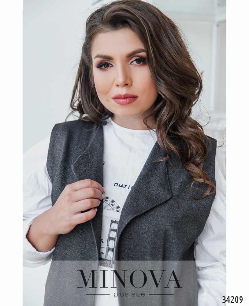 Стильный городской костюм прекрасно выглядит, если в его составе есть жилетка. В представленной в новом каталоге Minova модели костюм-двойка состоит из длинной жилетки и брюк. Жилетка из мягкой, но плотной ткани, с мягкими небольшими лацканами, а также в наличии два накладных кармана по бокам. Застёжек и пояса в комплекте нет, так что жилетка по фасону напоминает кардиган. Брюки из мягкой эластичной ткани, со вшитой в пояс резинкой и карманами по бокам. Костюм можно дополнить яркими аксессуарами и удобной обувью. В каталоге представлены однотонные модели и модель с неброским принтом на сером фоне.