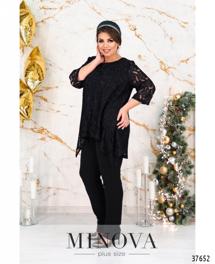Нарядный костюм-двойка с блузой и брюками. Блуза с вырезом горловины «лодочкой», подкладкой и кружевом, рукава без подкладки, кружевные. Подол блузы асимметричный: спереди короче, а подкладка ещё более короткая. По спинке длиннее. На кружеве блёстки. Брюки высокой посадки, прямого кроя, со вшитой в пояс резинкой и прорезными карманами, без манжет.