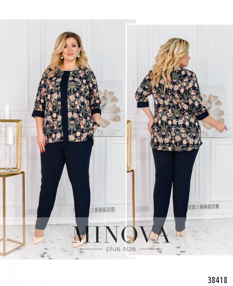 Нежный костюм-двойка батал с длинной блузой и брюками. Брюки с высокой талией, в пояс вшита резинка, по бокам - врезные карманы. Блуза без застёжек и карманов, по бокам на подоле - разрезы, рукава с контрастными манжетами.