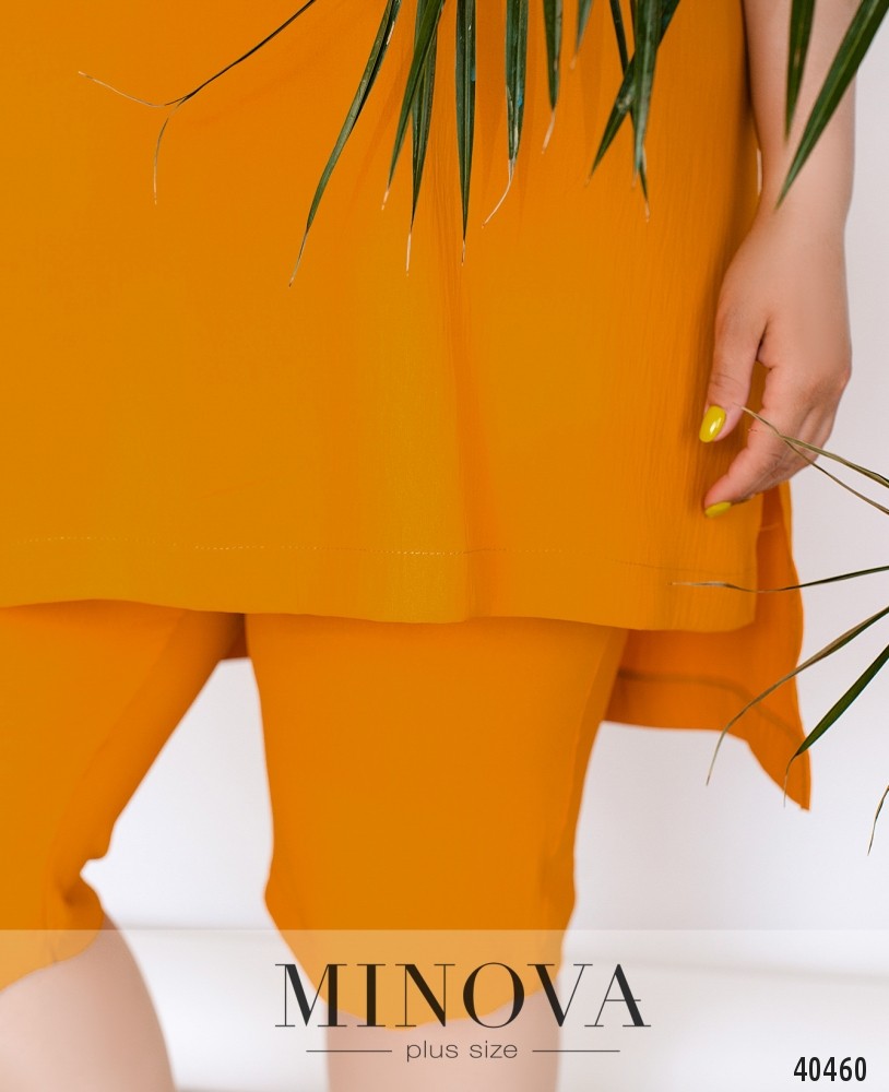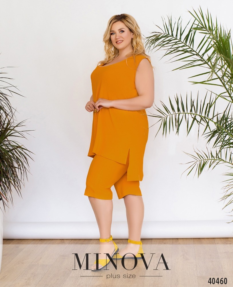 Лёгкий и удобный, минималистичный повседневный костюм с блузой и укороченными брюками. Брюки с высокой талией, в пояс вшита резинка, карманов и застёжек нет. Блуза с широким вырезом горловины, без рукавов, подол асимметричный, по спинке длиннее, по бокам разрезы. Застёжек и карманов нет.