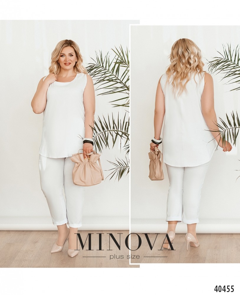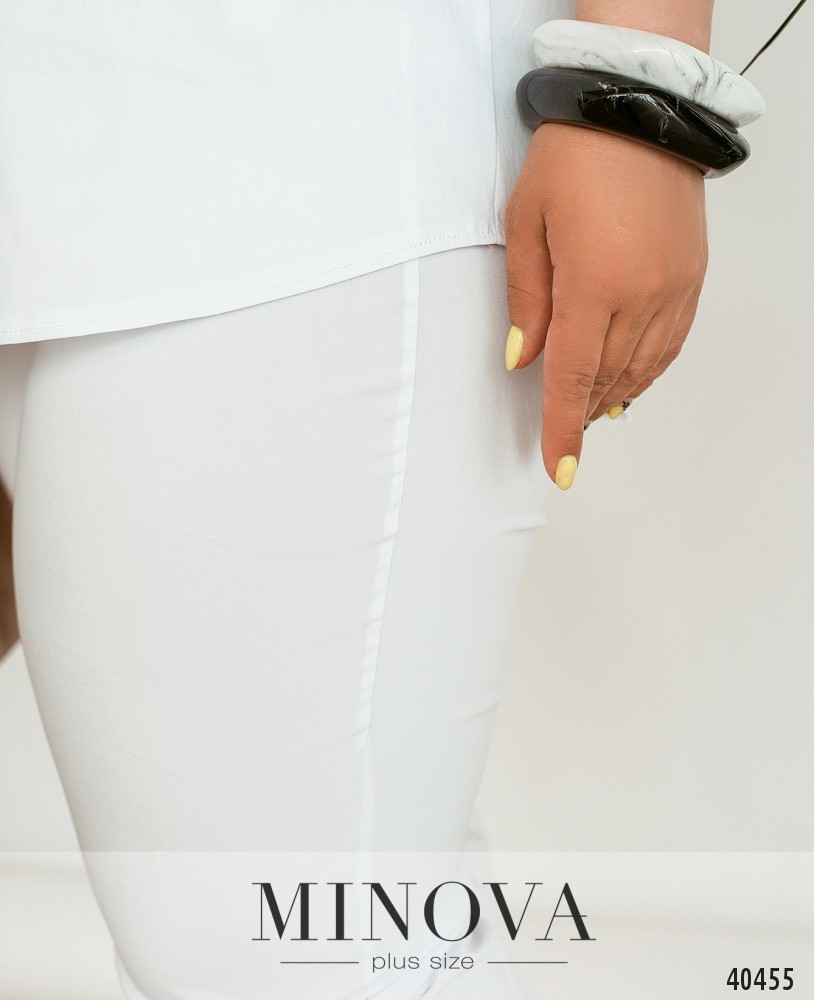 Минималистичный, очень удобный костюм-двойка батал со свободной блузой и с укороченными брюками. Блуза с широким полукруглым вырезом горловины, подол асимметричный, по спинке чуть длиннее. По бокам подола - разрезы. Застёжек и карманов нет. Брюки укороченные, в пояс вшита резинка, без застёжек и карманов, без манжет. Украшение входит в комплект.
