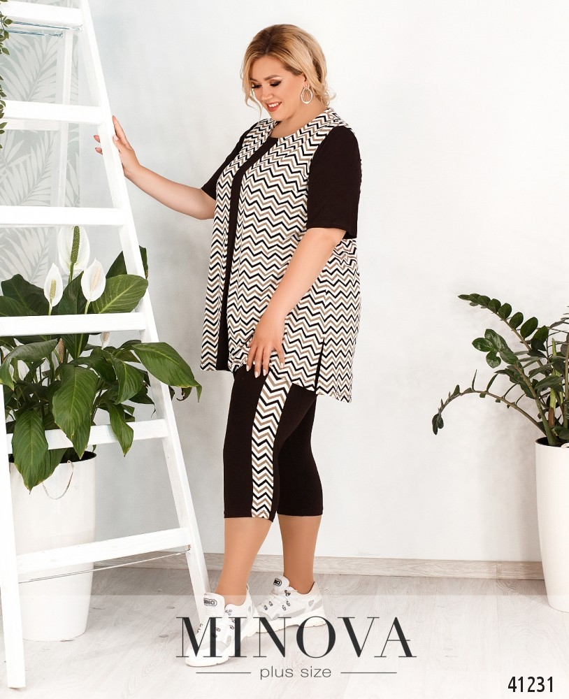Яркий и оригинальный костюм-двойка батал с брюками и туникой. Туника с разрезами по бокам подола, без застёжек и карманов, рукава без манжет, вырез горловины полукруглый, на груди вытачки. Брюки со вшитой в пояс резинкой, без карманов, с лампасами.