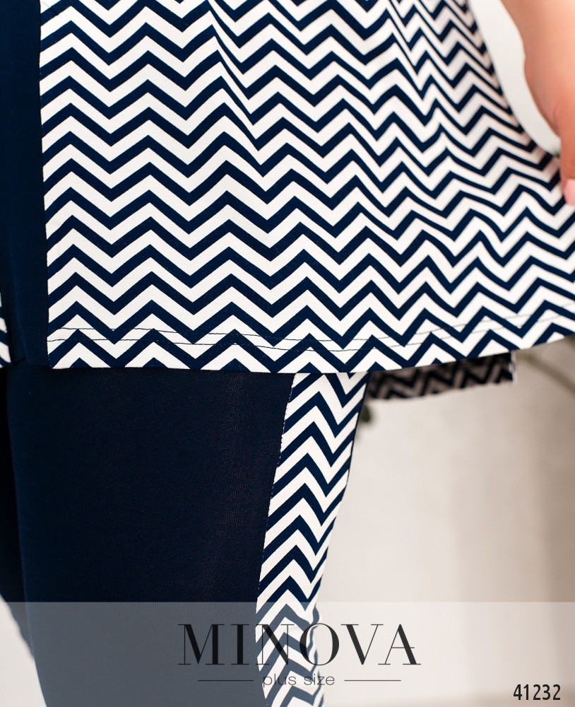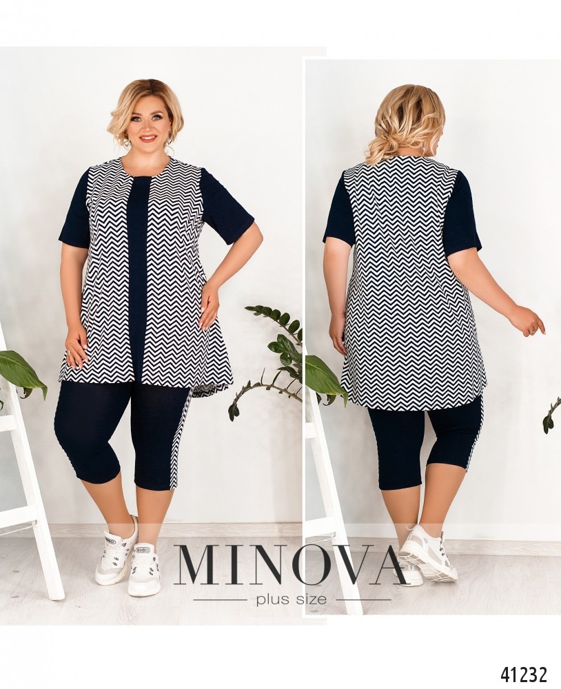 Яркий и оригинальный костюм-двойка батал с брюками и туникой. Туника с разрезами по бокам подола, без застёжек и карманов, рукава без манжет, вырез горловины полукруглый, на груди вытачки. Брюки со вшитой в пояс резинкой, без карманов, с лампасами.