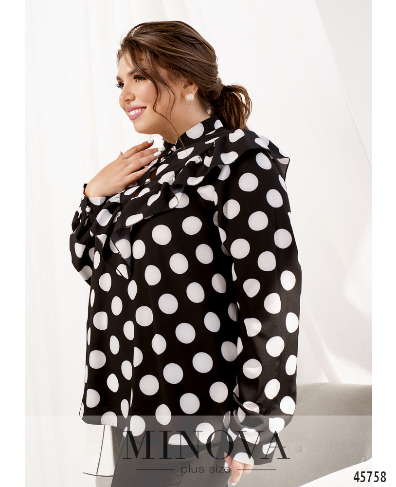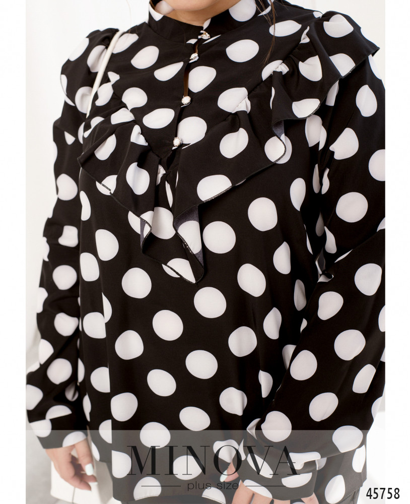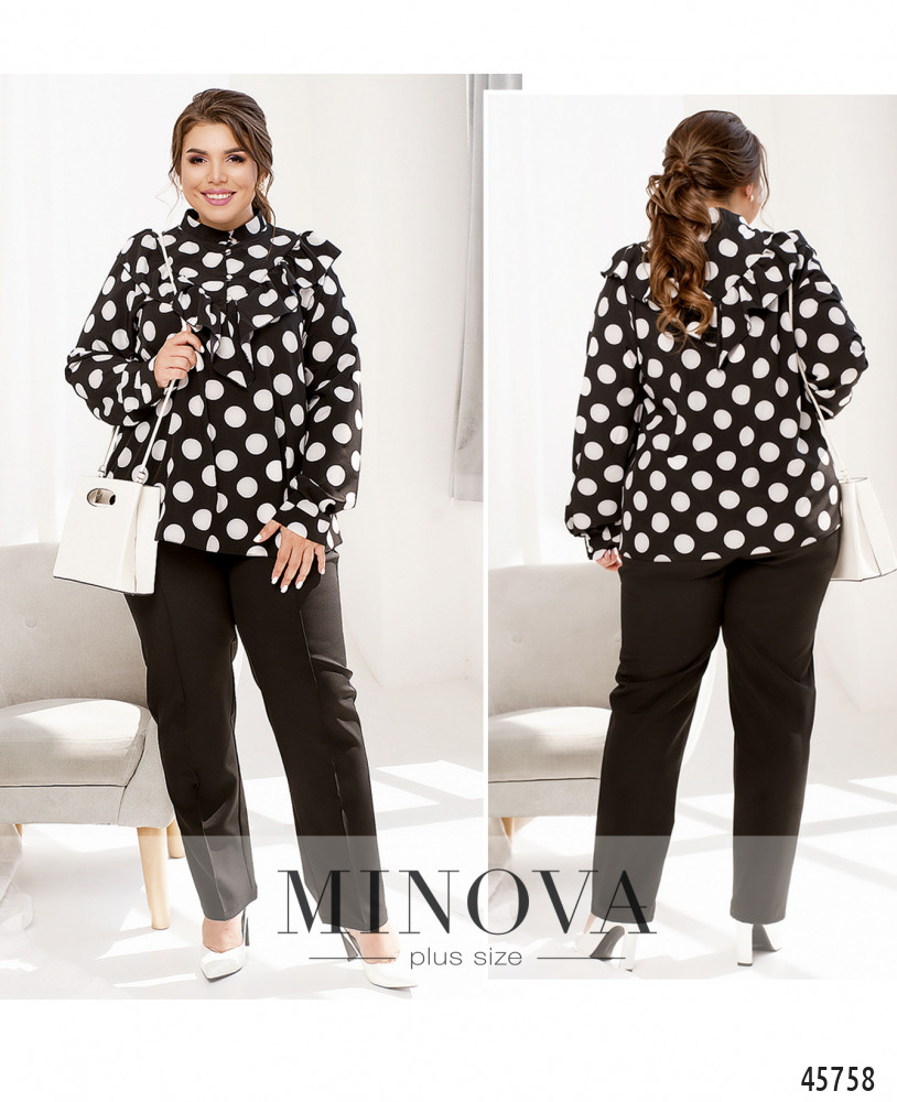 Этот классический костюм поможет вам создать романтический образ в рамках офисного дресс-кода. Женственная блуза с оборками от плеча до груди и длинными рукавами с манжетами на пуговицах, застегивается спереди на несколько маленьких пуговичек. Идеальным дополнением к ней являются однотонные лаконичные брюки на резинке с карманами в боковых швах.