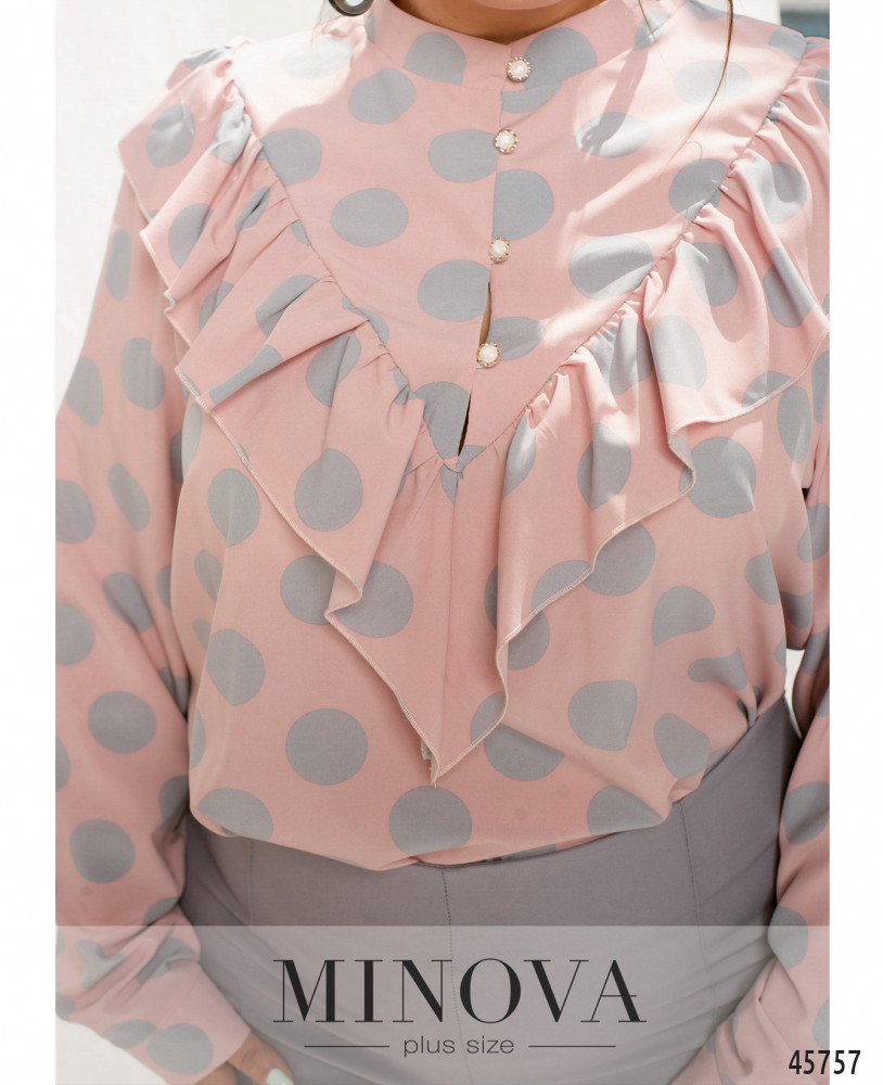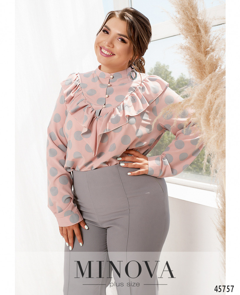 Этот классический костюм поможет вам создать романтический образ в рамках офисного дресс-кода. Женственная блуза с оборками от плеча до груди и длинными рукавами с манжетами на пуговицах, застегивается спереди на несколько маленьких пуговичек. Идеальным дополнением к ней являются однотонные лаконичные брюки на резинке с карманами в боковых швах.