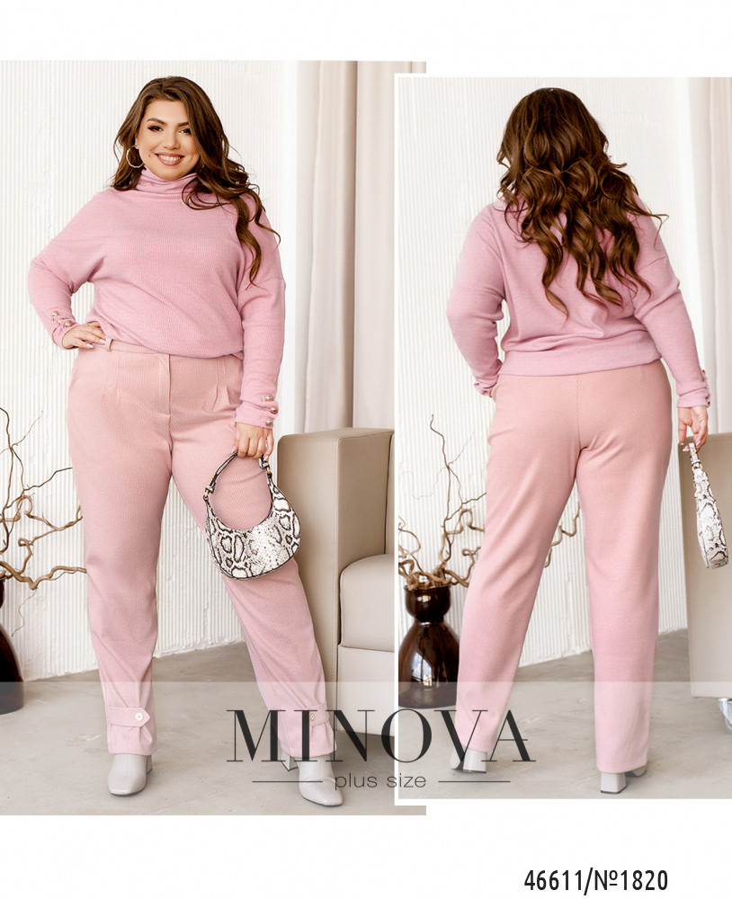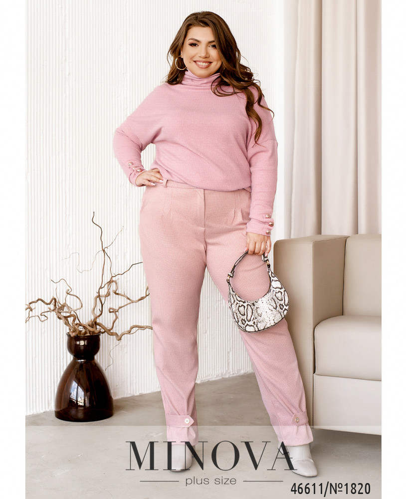 Стильный костюм, выполненный из мягких тканей, позволит вам в любую погоду и время года выглядеть женственно и привлекательно. Изюминкой данного комплекта являются выразительные брюки, застёгивающиеся на змейку и пуговицу, с декоративным хлястиком, стягивающим низ штанины спереди. Костюм идеально дополняет лаконичный однотонный гольф с пуговицами на рукавах.
