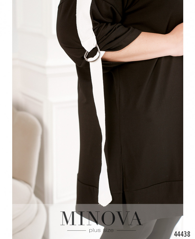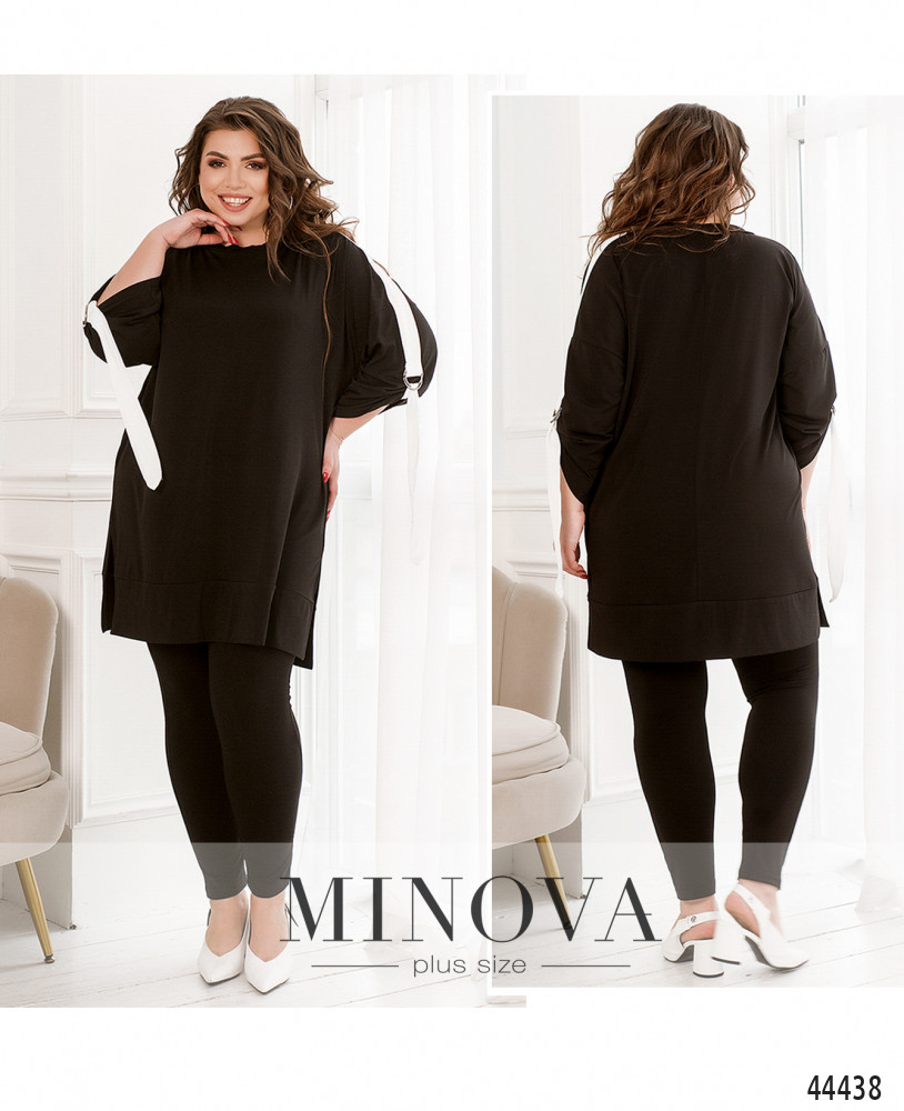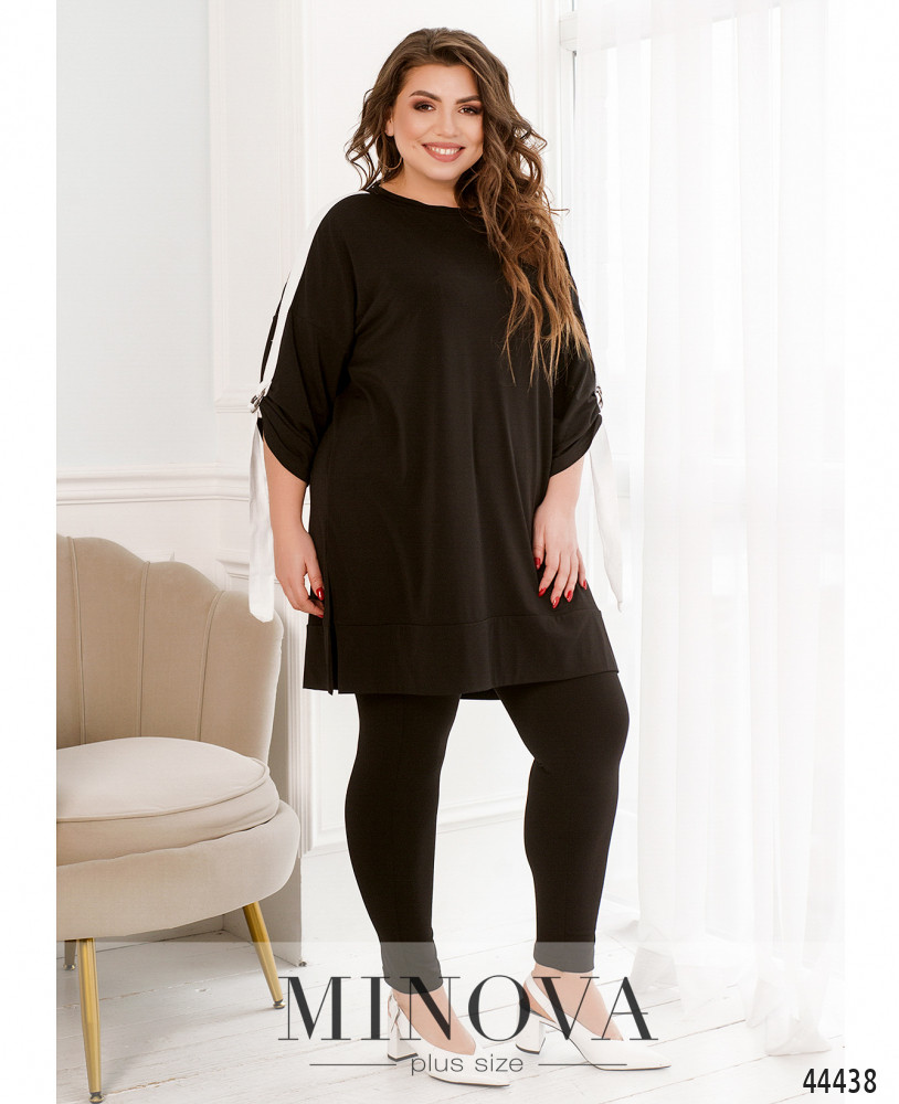 Стильный костюм-двойка батал, блуза с лацканами из ленты, которая оканчивается двумя металлическими полукольцами. Внутри рукава подшита такая же лента, так что длину рукава можно регулировать. Вырез горловины полукруглый, застёжек и карманов нет, подол с подшитым манжетом, крой свободный, по бокам подола - разрезы. Брюки фасона "лосины", в пояс вшита плотная резинка, карманов и застёжек нет.
