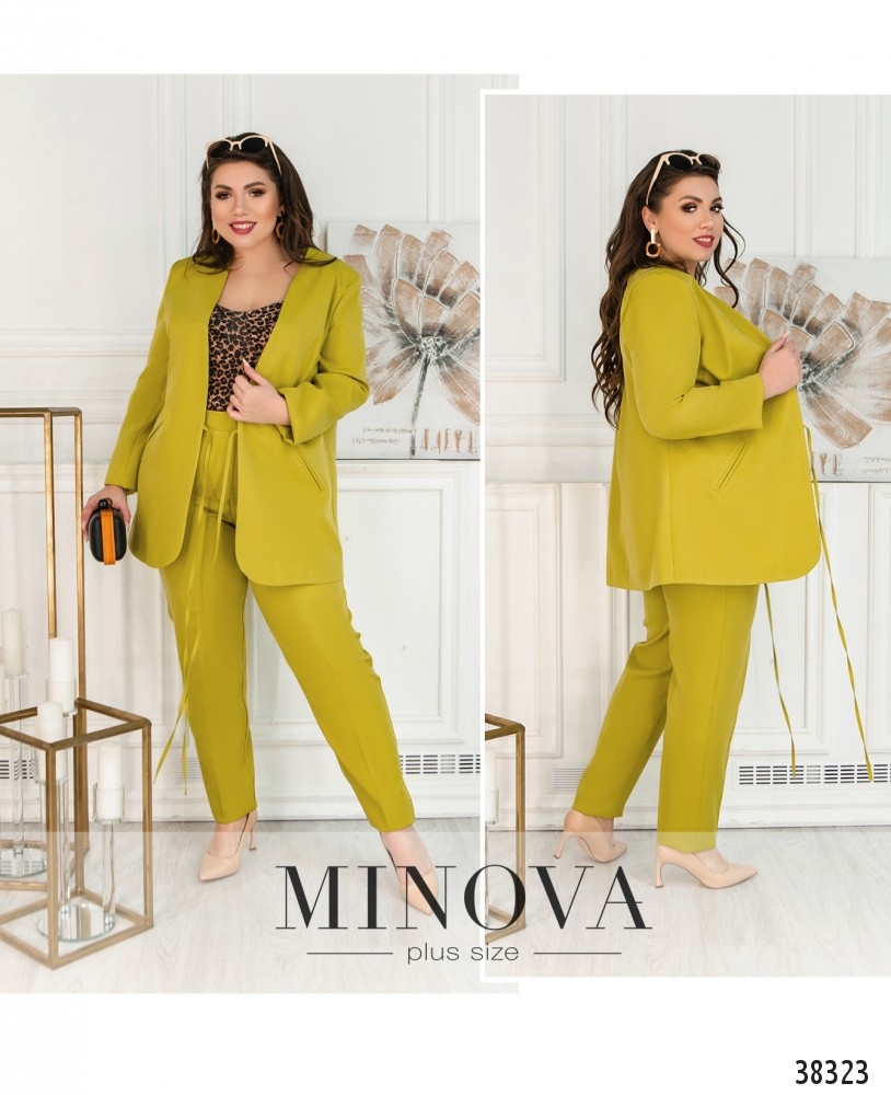 Привлекательный и женственный деловой костюм-двойка большого размера. Жакет без застёжек, на завязках, по бокам – врезные карманы. В наличии подплечники, подкладки нет. Брюки с декоративными швами-«стрелками», в пояс сзади вшита резинка, по бокам – врезные карманы, застёжек нет, есть декоративная ширинка.