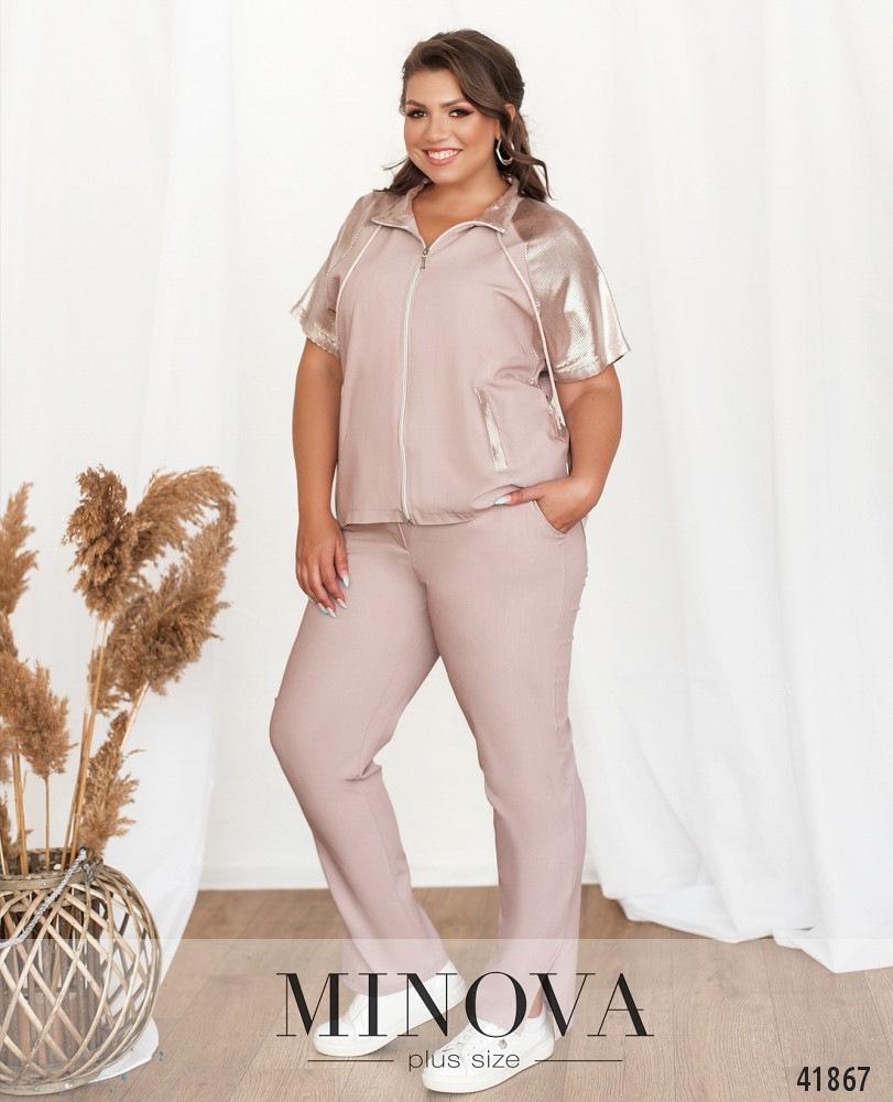 Стильный и очаровательный костюм-двойка большого размера. Свитшот с молнией по центру, с воротником-стоечкой, через который пропущен шнурок. Спинка разделена пополам, через талию также пропущен шнурок, длина асимметричная. Рукава, клапаны на карманах и воротник контрастные, блестящие. Брюки с высокой талией, в пояс сзади вшита резинка, в наличии декоративная ширинка, по бокам - врезные карманы. По бокам брючин снизу - длинные разрезы.