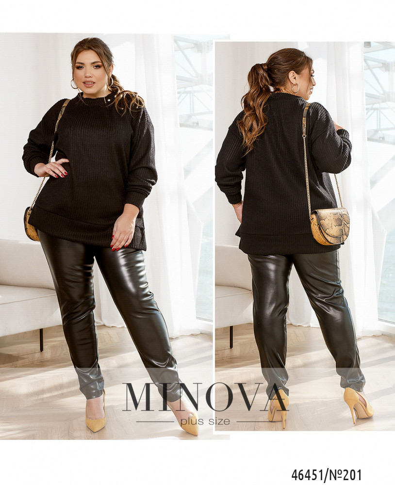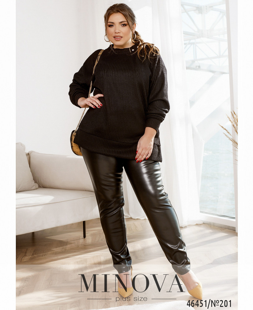 Женственный костюм, состоящий из брюк и туники, можно носить вместе или разделить, создавая различные образы с другими вещами. Минималистичные черные брюки на резинке с карманами, выполненные из эко кожи, идеально дополнены мягкой однотонной туникой с приспущенной линией плеч и небольшими разрезами по бокам.