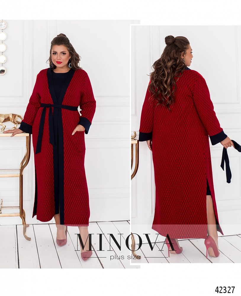 Мягкий и очень комфортный костюм батал. Платье застегивается на потайную змейку по спинке, на груди и на спине вытачки, вырез горловины полукруглый, в комплекте пояс в тон. Кардиган с накладными карманами, по бокам подола - длинные разрезы. Подкладки и застёжек нет. Пояс/аксессуар входит в комплект.