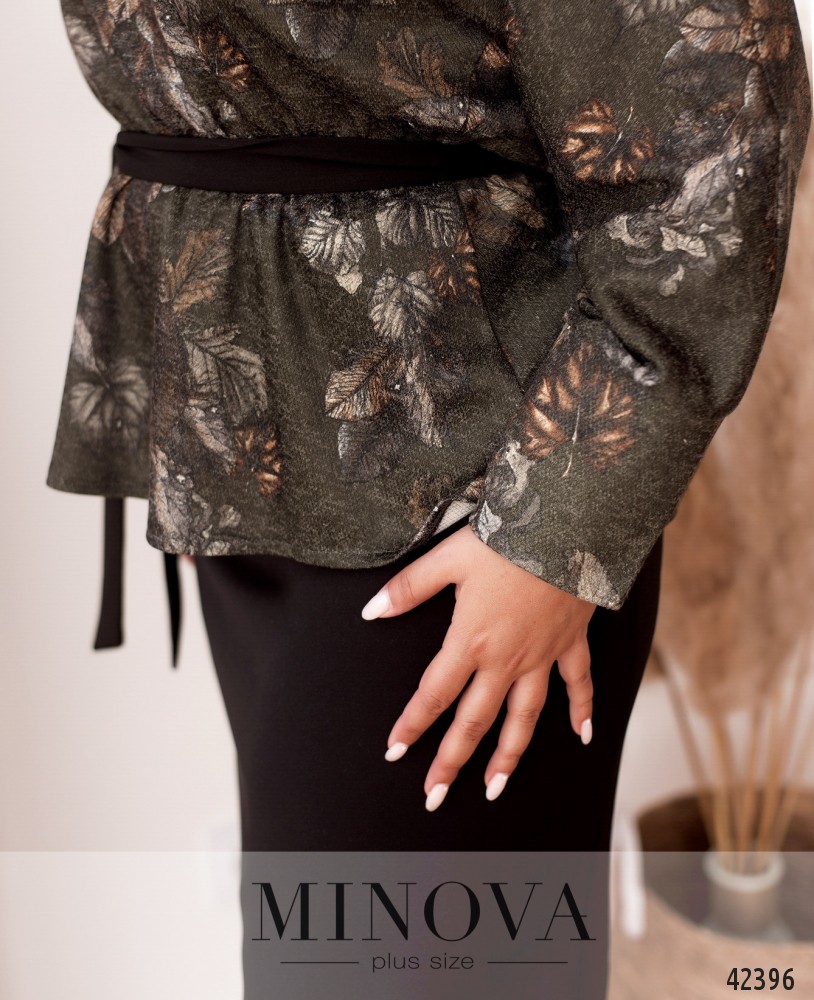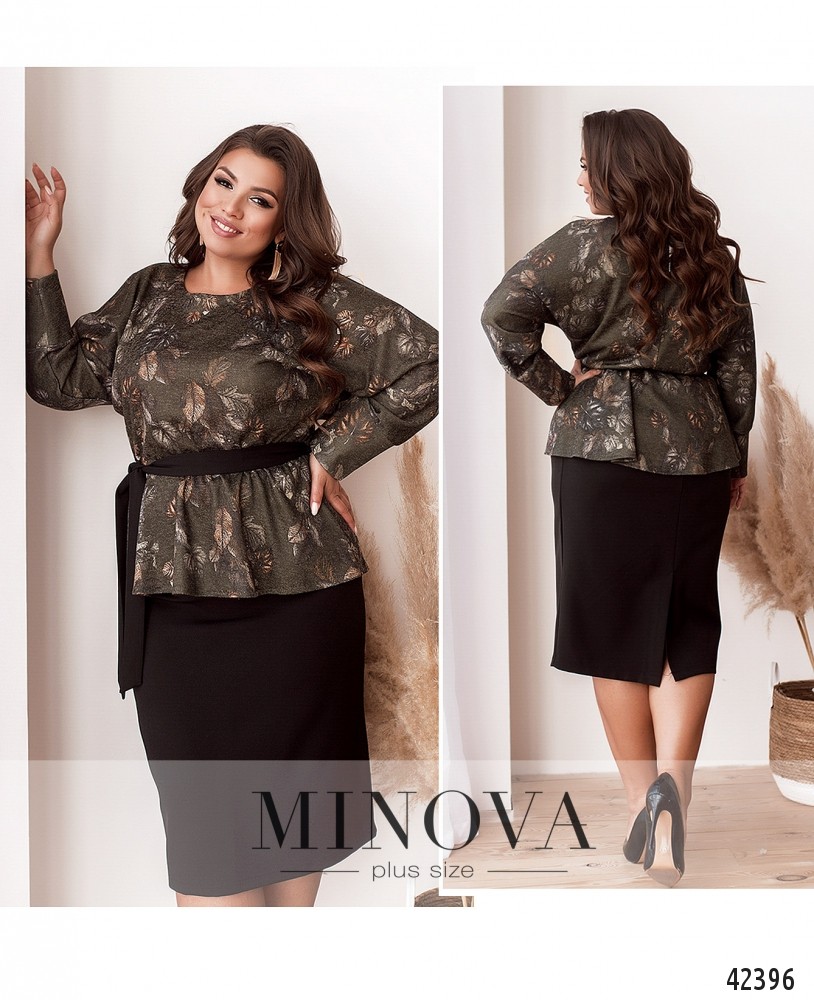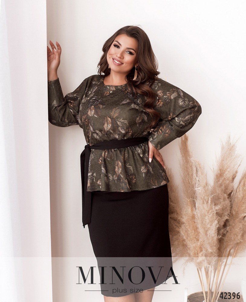Привлекательный костюм плюс сайз с блузой и юбкой. Блуза мягкая, с длинными манжетами на рукавах, с баской по подолу и вшитой в пояс резинкой. Вырез горловины полукруглый, застёжек и карманов нет. Юбка без карманов и застёжек, сзади в пояс вшита резинка. В комплекте пояс.