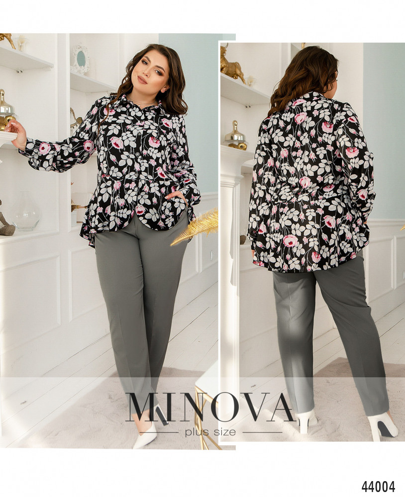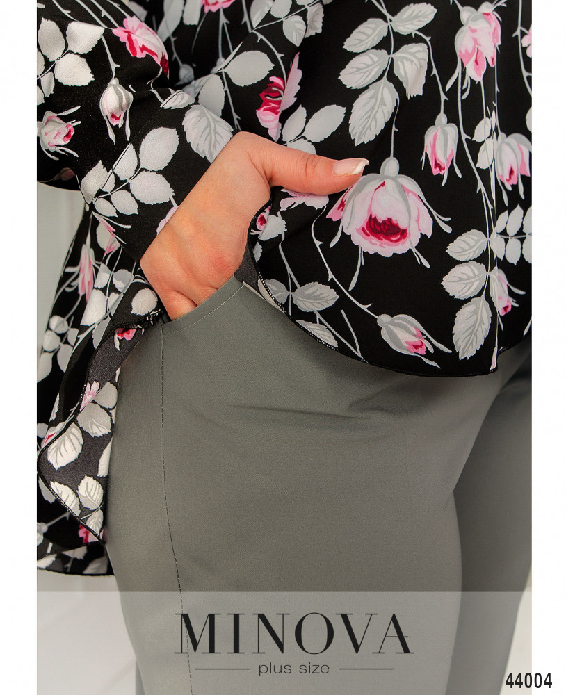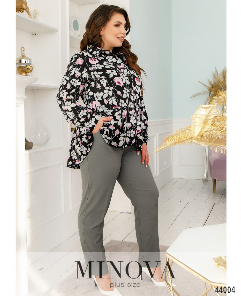 Изысканный костюм батал с блузой и брюками. Блуза с очаровательным цветочным принтом, с оборками внизу подола. Без карманов, воротничок отложной, на манжетах - по одной пуговке. Застёжка - ряд пуговиц спереди на планке. На груди вытачки. Брюки с карманами в шве по бокам, в пояс сзади вшита резинка, спереди - декоративная ширинка, посадка высокая.