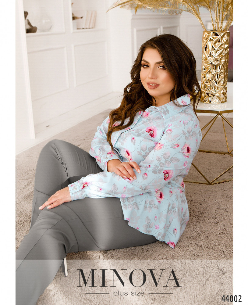 Изысканный костюм батал с блузой и брюками. Блуза с очаровательным цветочным принтом, с оборками внизу подола. Без карманов, воротничок отложной, на манжетах - по одной пуговке. Застёжка - ряд пуговиц спереди на планке. На груди вытачки. Брюки с карманами в шве по бокам, в пояс сзади вшита резинка, спереди - декоративная ширинка, посадка высокая.
