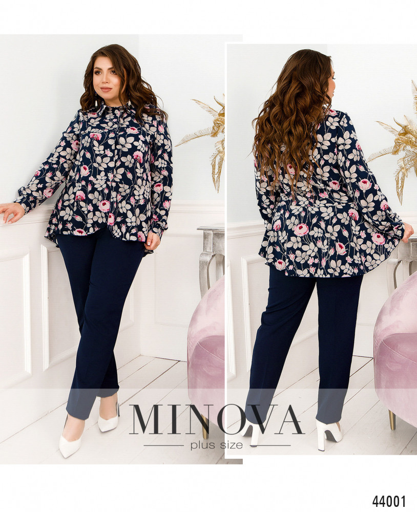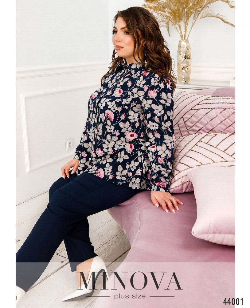 Изысканный костюм батал с блузой и брюками. Блуза с очаровательным цветочным принтом, с оборками внизу подола. Без карманов, воротничок отложной, на манжетах - по одной пуговке. Застёжка - ряд пуговиц спереди на планке. На груди вытачки. Брюки с карманами в шве по бокам, в пояс сзади вшита резинка, спереди - декоративная ширинка, посадка высокая.
