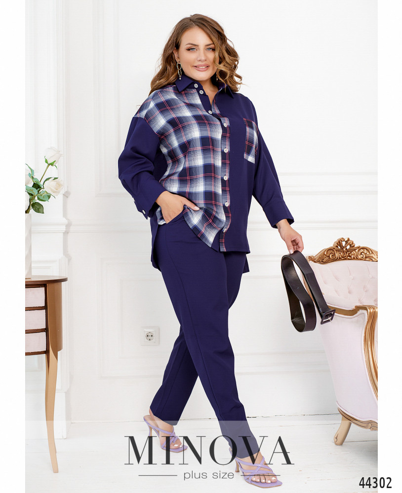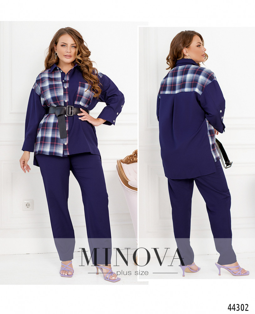 Яркий, стильный и привлекательный костюм двойка батал. Рубашка с контрастной полочкой, кокеткой и накладным карманом на груди. На рукавах - плотные манжеты, на них по четыре пуговки. Застёгивается рубашка на ряд пуговиц спереди на планке. Воротничок отложной. Спинка чуть длиннее, по бокам подола небольшие разрезы. Брюки с высокой талией, в пояс вшита резинка, по бокам карманы в шве.