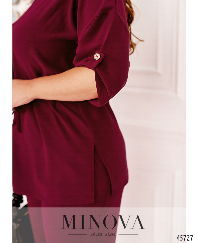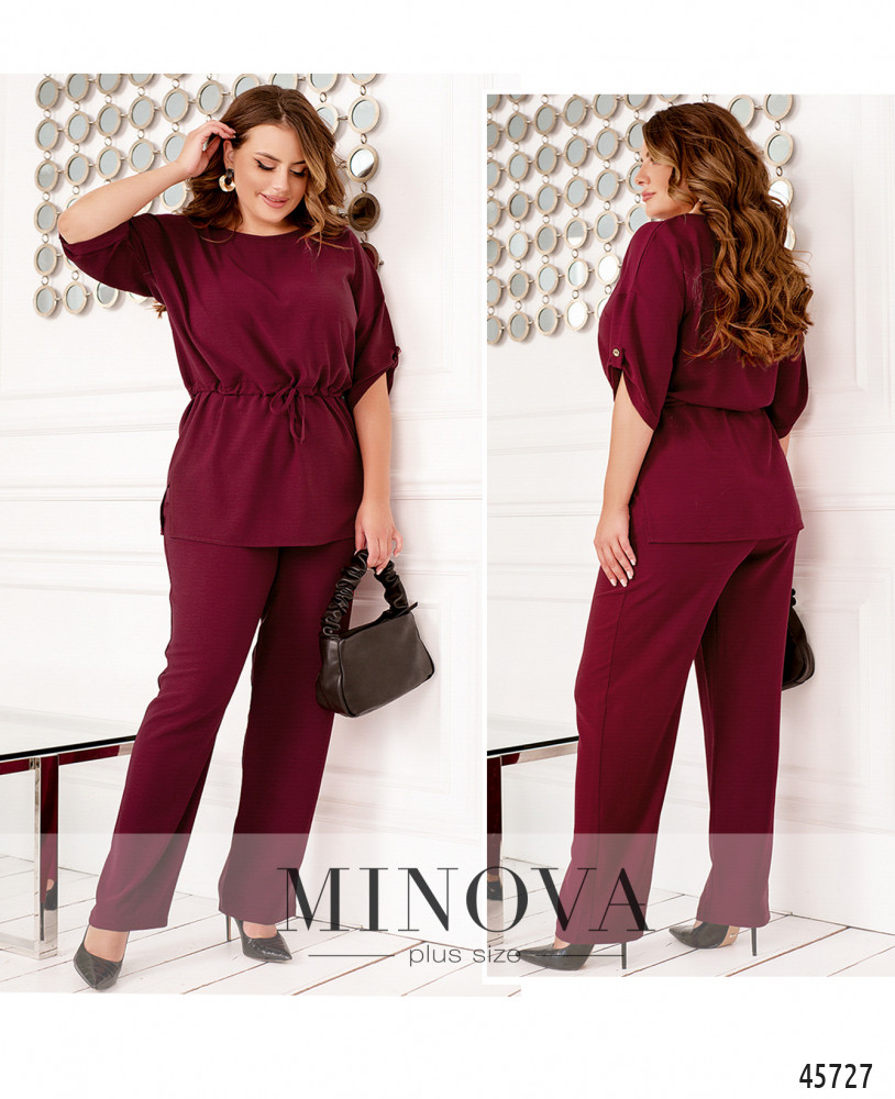 Минималистичный костюм батал, футболка без застежек и карманов, через талию под кулиской пропущен шнурок, по бокам подола - разрезы. Вырез горловины полукруглый. На рукавах небольшие отвороты. Брюки с высокой талией, в пояс вшита резинка, по бокам - карманы в шве.