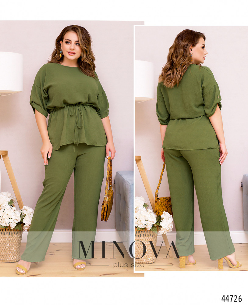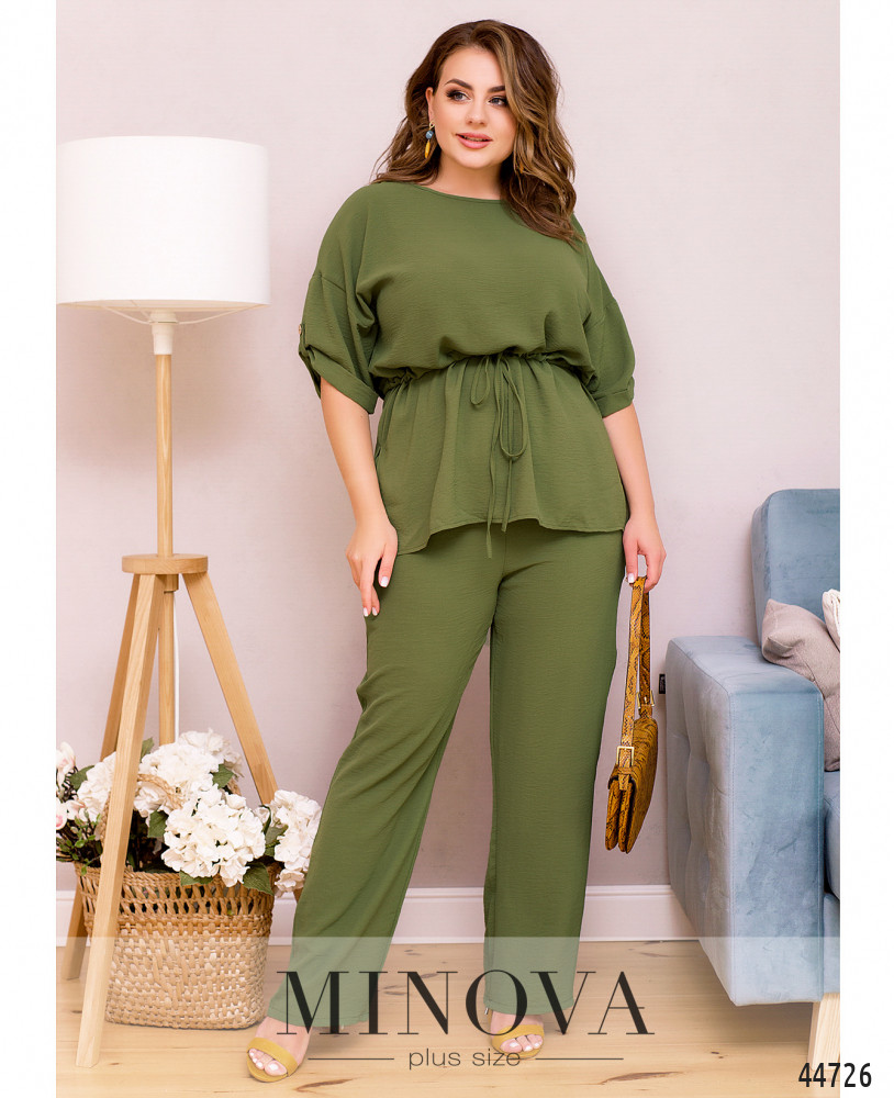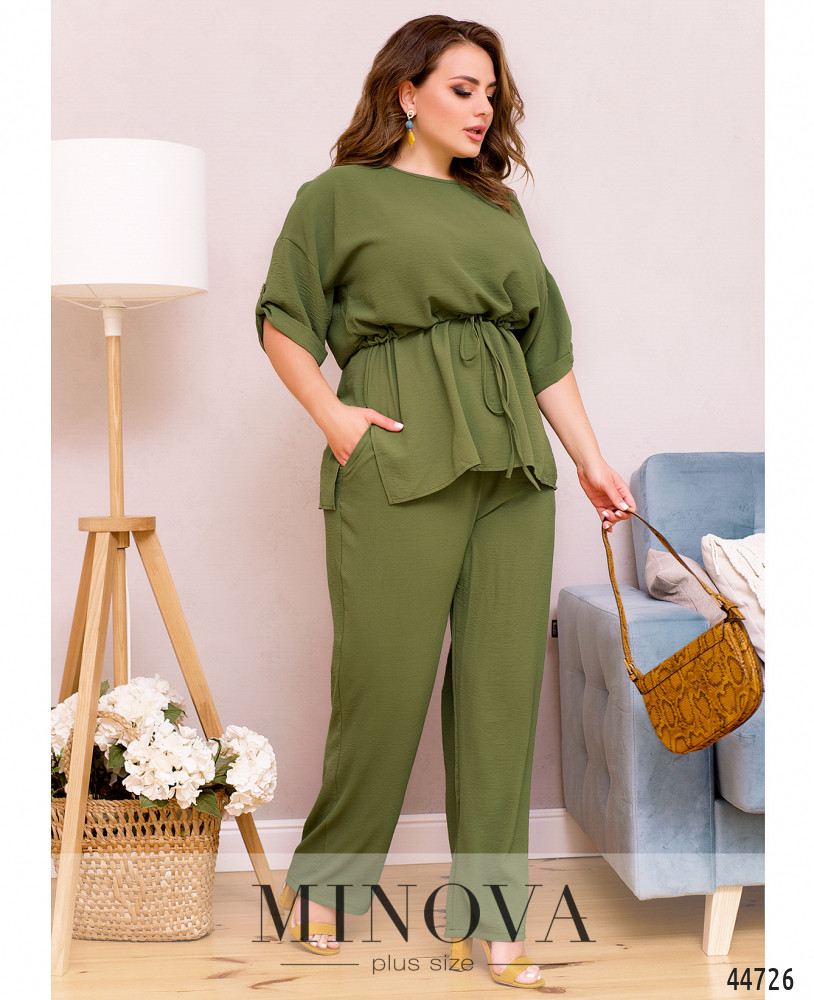 Минималистичный костюм батал, футболка без застежек и карманов, через талию под кулиской пропущен шнурок, по бокам подола - разрезы. Вырез горловины полукруглый. На рукавах небольшие отвороты. Брюки с высокой талией, в пояс вшита резинка, по бокам - карманы в шве.