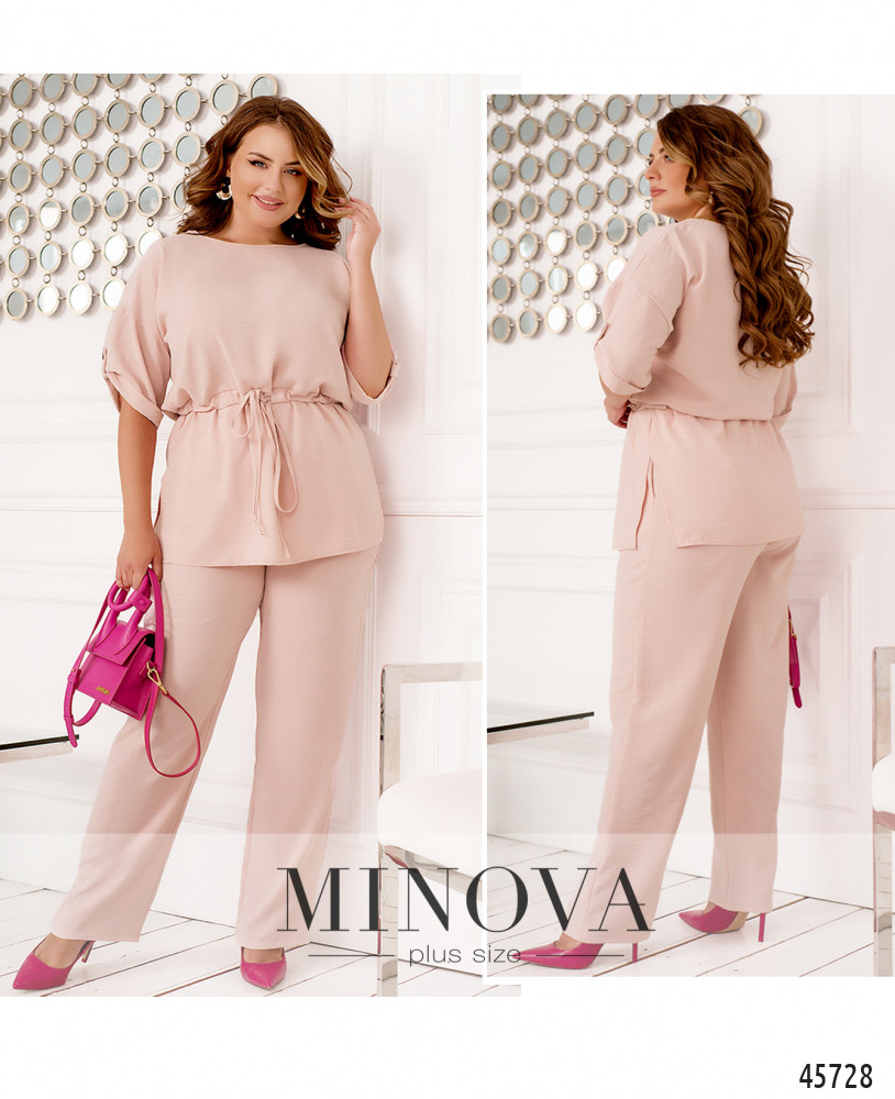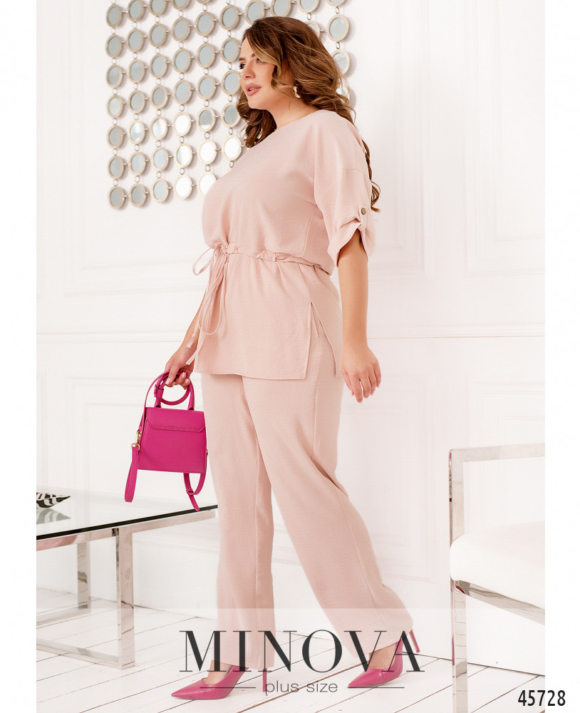 Минималистичный костюм батал, футболка без застежек и карманов, через талию под кулиской пропущен шнурок, по бокам подола - разрезы. Вырез горловины полукруглый. На рукавах небольшие отвороты. Брюки с высокой талией, в пояс вшита резинка, по бокам - карманы в шве.