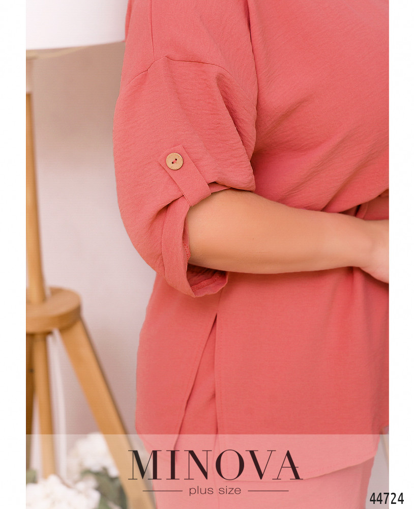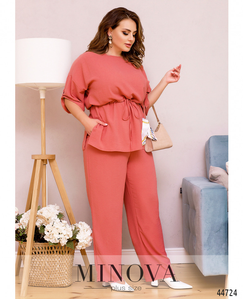 Минималистичный костюм батал, футболка без застежек и карманов, через талию под кулиской пропущен шнурок, по бокам подола - разрезы. Вырез горловины полукруглый. На рукавах небольшие отвороты. Брюки с высокой талией, в пояс вшита резинка, по бокам - карманы в шве.