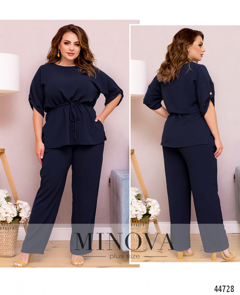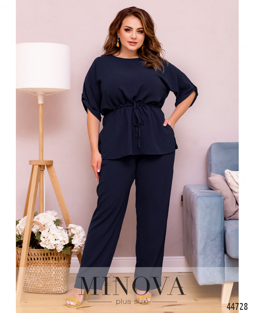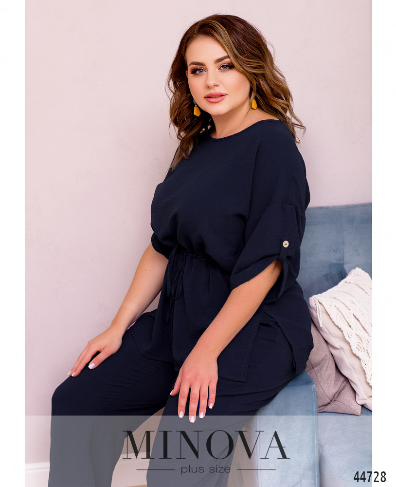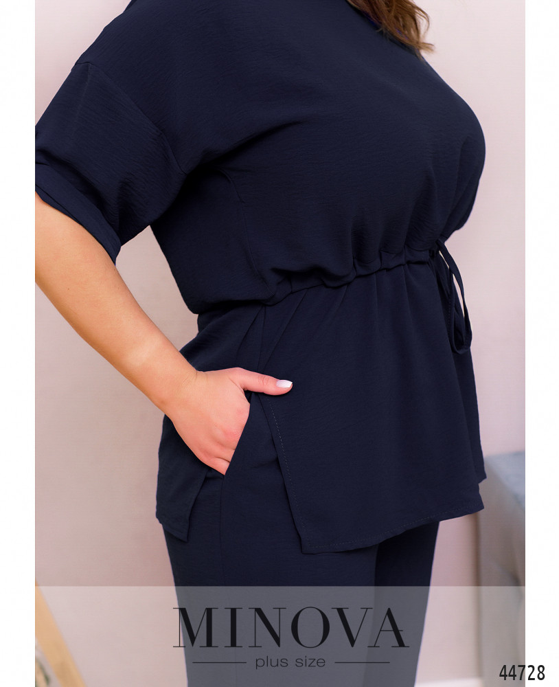 Минималистичный костюм батал, футболка без застежек и карманов, через талию под кулиской пропущен шнурок, по бокам подола - разрезы. Вырез горловины полукруглый. На рукавах небольшие отвороты. Брюки с высокой талией, в пояс вшита резинка, по бокам - карманы в шве.