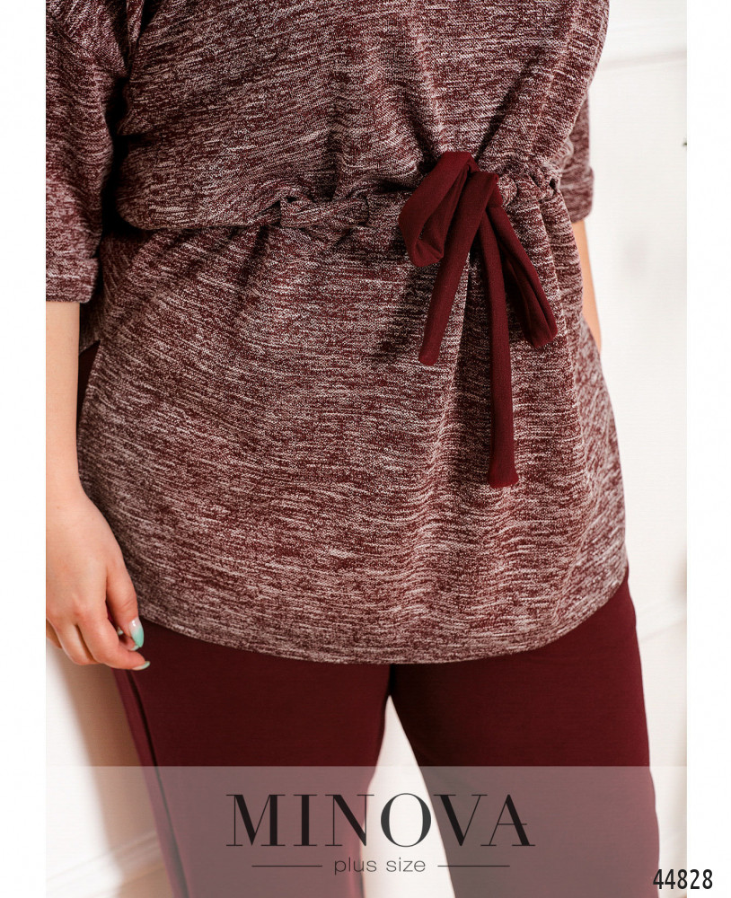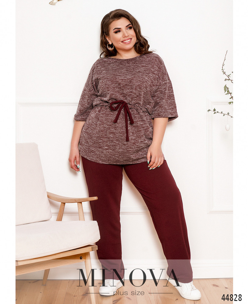 Стильный костюм-двойка батал из меланжевой ткани. Блуза с приспущенным плечом, рукава с небольшими отворотами. Вырез горловины полукруглый. Через талию пропущен шнурок под планкой. По бокам подола - небольшие разрезы. Застёжек и карманов нет. Брюки с высокой талией, по бокам - карманы в шве, в пояс вшита резинка, застежек нет.