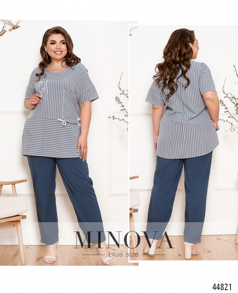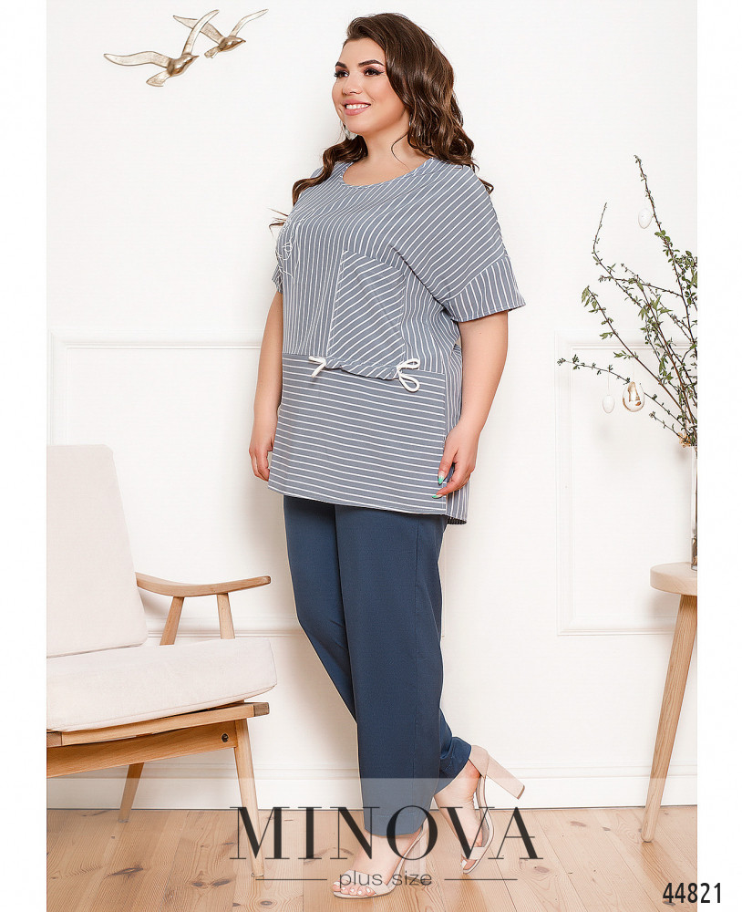 Элегантный костюм-двойка плюс сайз, брюки без застёжек, со вшитой в пояс резинкой, посадка высокая, по бокам - карманы в шве. Блуза с накладным карманом на груди и с принтом, рукава без манжет, по бокам подола - разрезы. Через карман снизу пропущен шнурок. Вырез горловины полукруглый, застёжек нет.