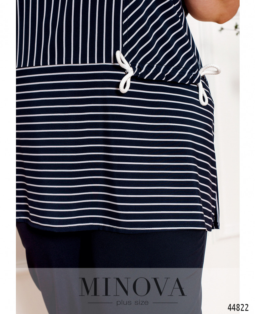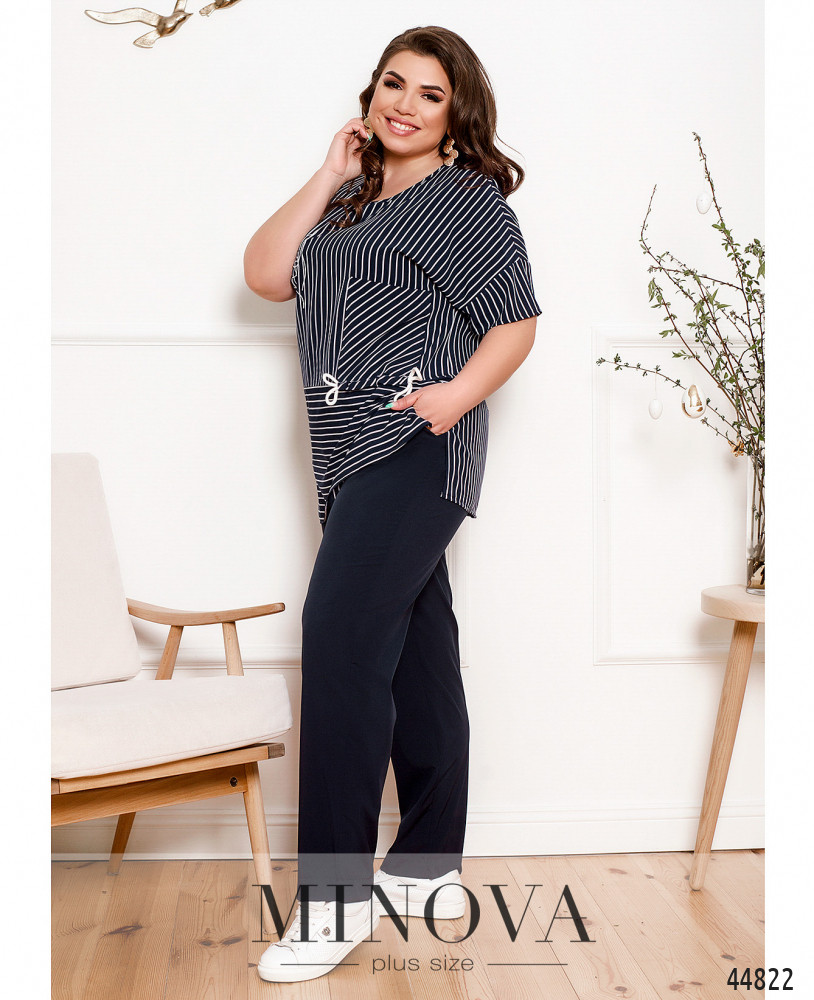 Элегантный костюм-двойка плюс сайз, брюки без застёжек, со вшитой в пояс резинкой, посадка высокая, по бокам - карманы в шве. Блуза с накладным карманом на груди и с принтом, рукава без манжет, по бокам подола - разрезы. Через карман снизу пропущен шнурок. Вырез горловины полукруглый, застёжек нет.