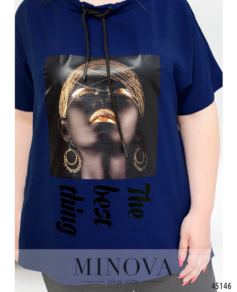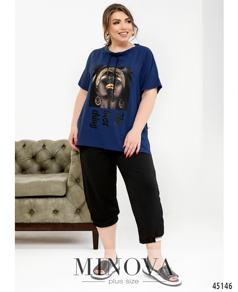 Легкий контрастный костюм в стиле casual туникой и брюками-капри сделает вас еще ярче этим летом. Невесомая туника с подвижным декоративным шнурком в полукруглом вырезе горловины и спущенными короткими рукавами декорирована креативным принтом. Ее дополняют темные укороченные брюки-капри с резинками, вшитыми в пояс и в манжеты штанин.