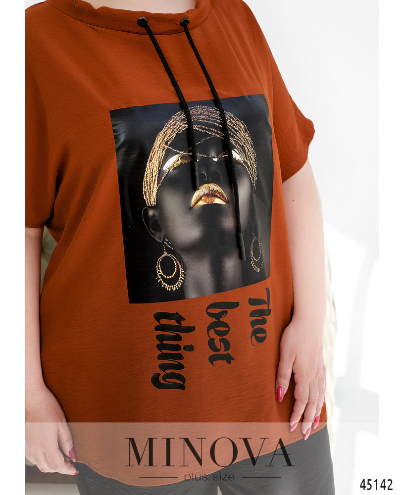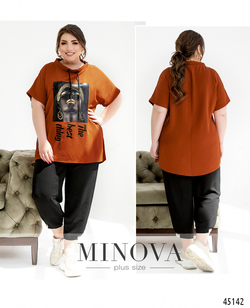 Легкий контрастный костюм в стиле casual туникой и брюками-капри сделает вас еще ярче этим летом. Невесомая туника с подвижным декоративным шнурком в полукруглом вырезе горловины и спущенными короткими рукавами декорирована креативным принтом. Ее дополняют темные укороченные брюки-капри с резинками, вшитыми в пояс и в манжеты штанин.