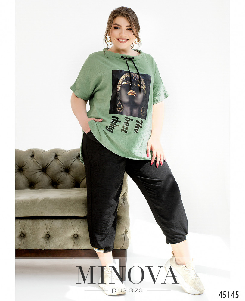 Легкий контрастный костюм в стиле casual туникой и брюками-капри сделает вас еще ярче этим летом. Невесомая туника с подвижным декоративным шнурком в полукруглом вырезе горловины и спущенными короткими рукавами декорирована креативным принтом. Ее дополняют темные укороченные брюки-капри с резинками, вшитыми в пояс и в манжеты штанин.